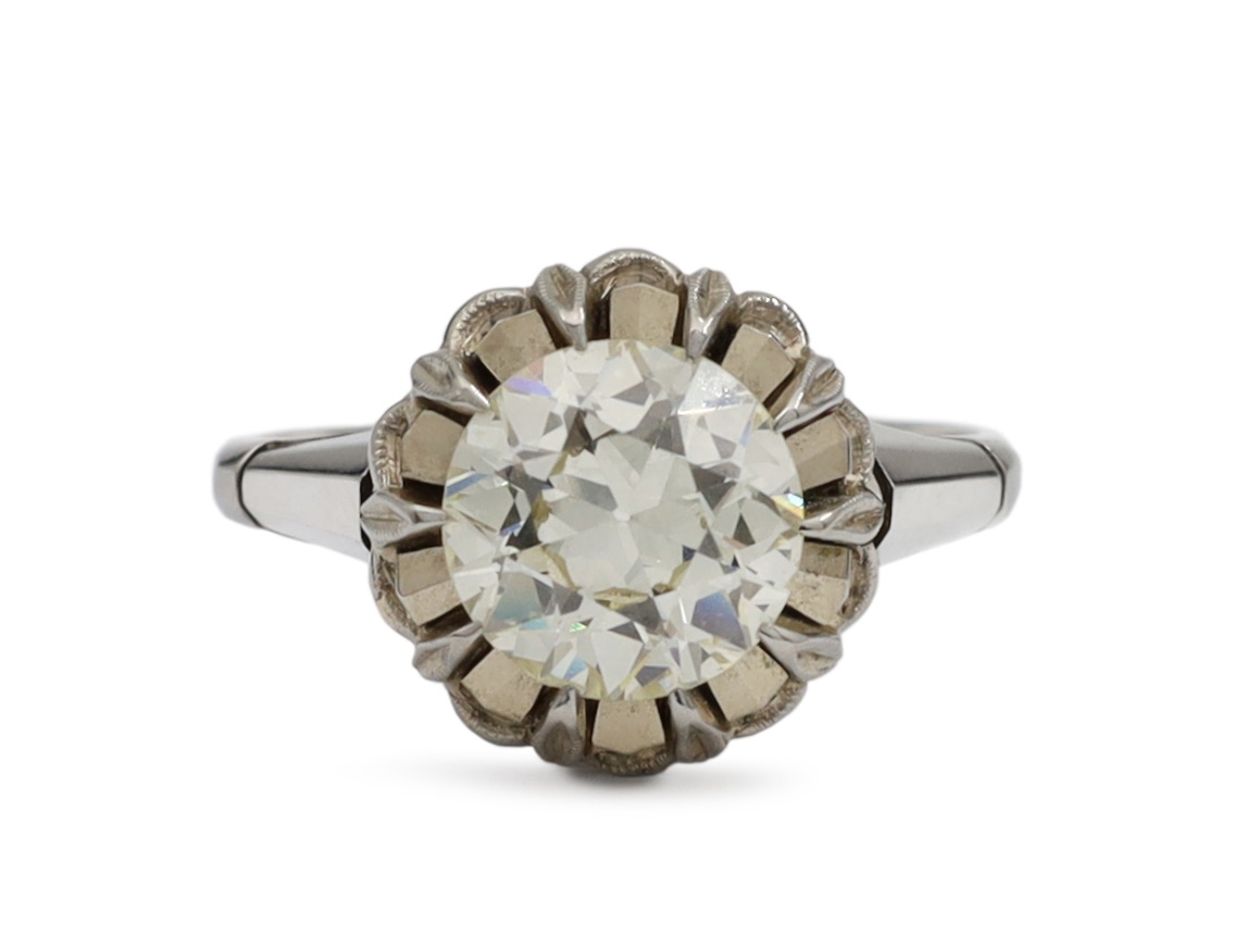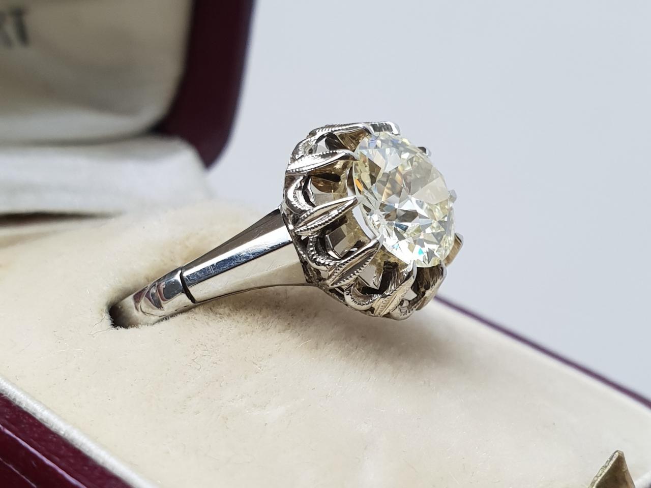 Vintage 1.80ct diamond solitaire engagement ring in 18kt white gold. Set with an estimated 1.80ct round Old European cut diamond in a raised clawed collet setting, decorated with faceted metal between each recess of the claws, the curving claws decorated with millegrain borders and the base elaborately etched with foliate motifs, flanked by faceted trumpeting shoulders which terminate at raised ridges before smoothing to a solid shank.