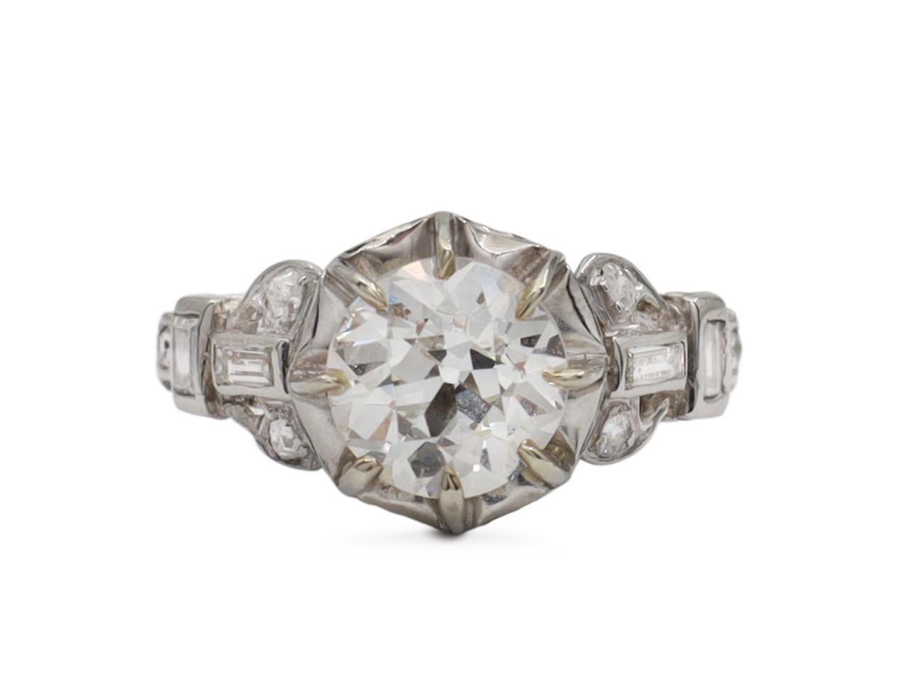 Vintage 1.84ct Old European cut diamond fancy solitaire ring in platinum. Centred with an estimated 1.84ct round Old European cut diamond in a raised illusion setting, flanked by four rectangular baguette cut diamonds in rubover settings, further decorated by six round old cut diamonds in grain settings, to an elaborate diamond solitaire featuring curving claws, structured gallery and raised diamond set shoulders supported by subtle cheniers, terminating to a solid shank. Hallmarked platinum, London, 2003.