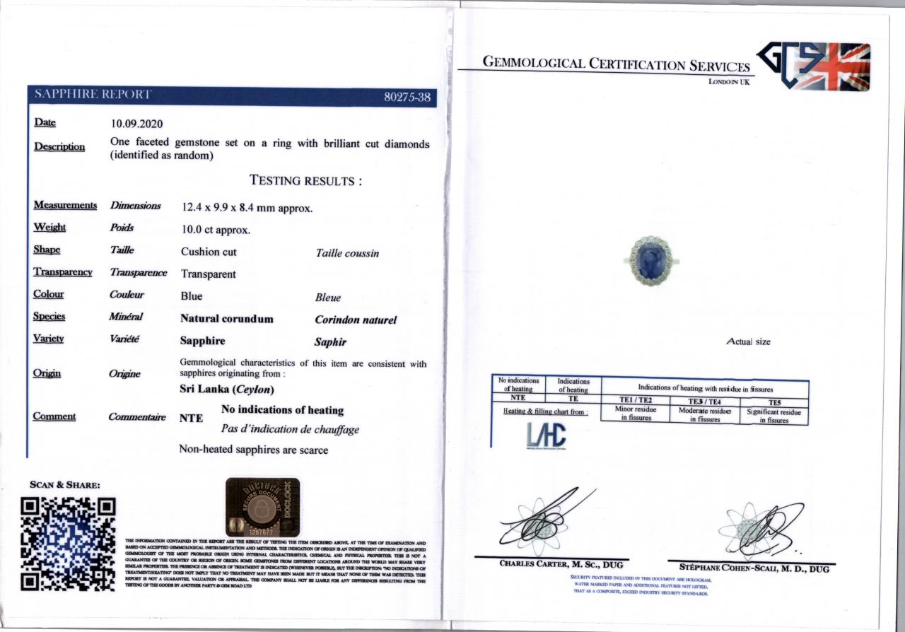 10ct Ceylon sapphire and diamond oval cluster ring. Centrally set with a 10ct oval mixed cut Ceylon sapphire with no indication of heat treatment, in a raised claw setting, encircled by a row of round cut diamonds in grain and rubover settings, to a floral cluster design with curving claws and scalloped edging, decorated with an openwork gallery and flanked to either side with raised inwardly tapering shoulders which smooth to a solid shank. Marked platinum. Accompanied by Gemological Certification Services certificate no.80275-38.