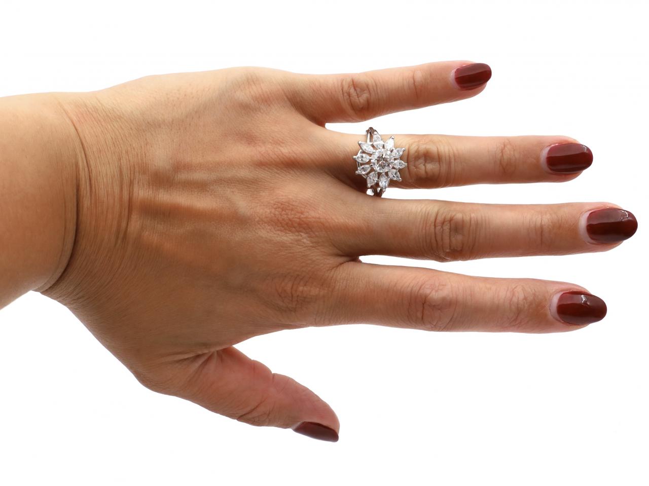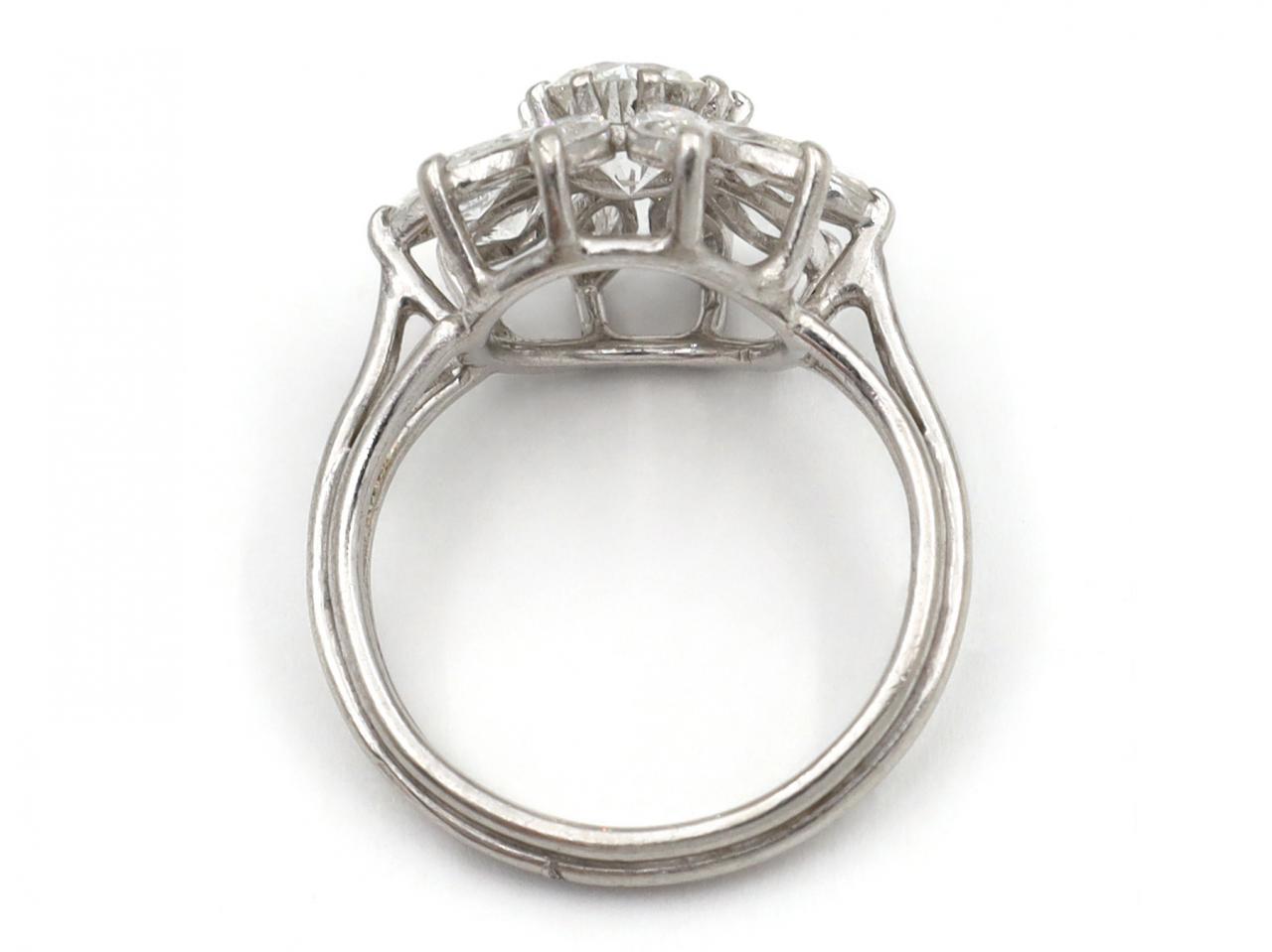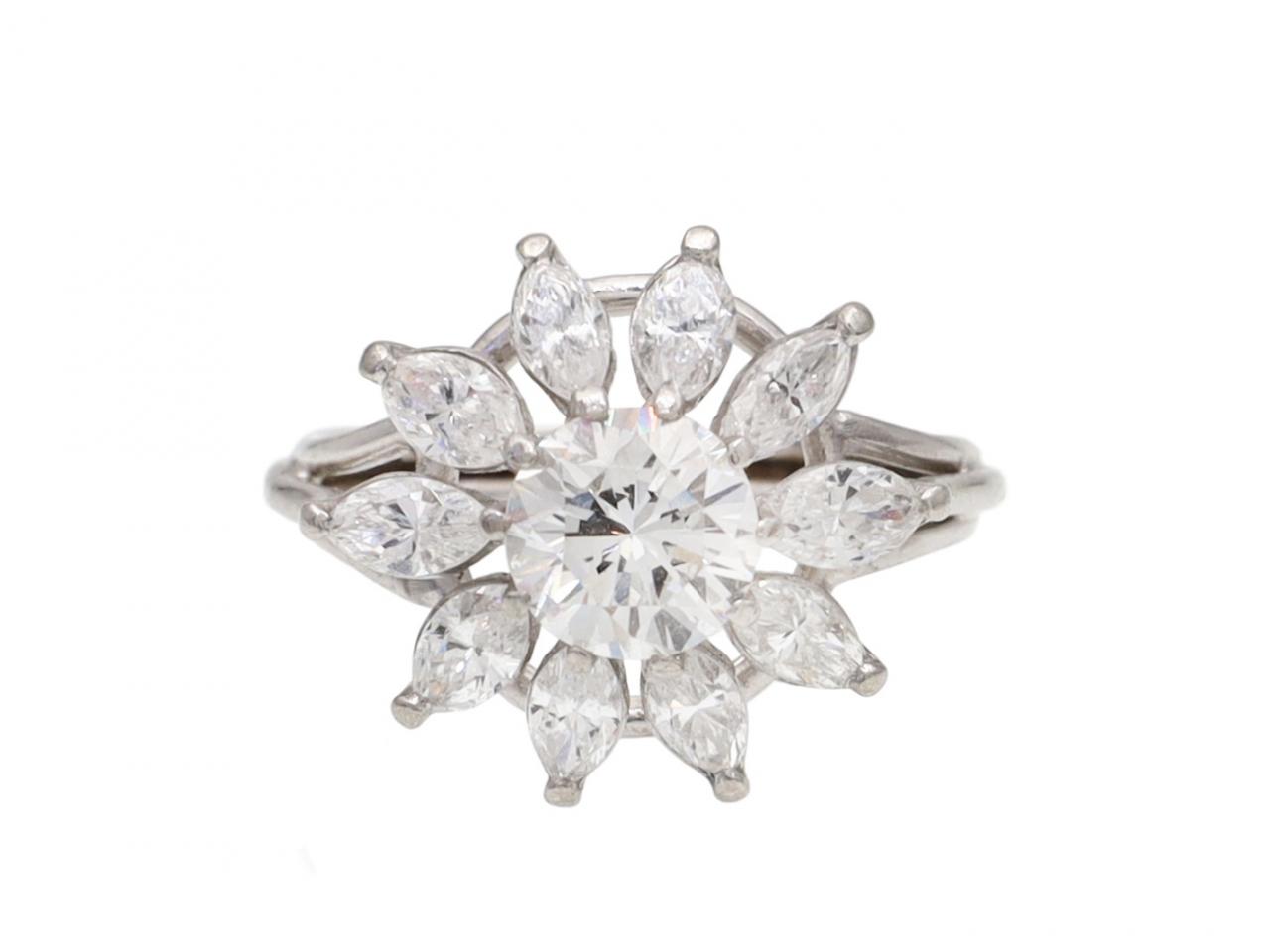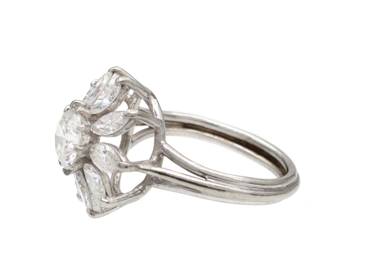 Vintage 18kt white gold diamond fancy cluster ring. Centrally set with an estimated 1.10ct round old European cut diamond in a raised claw setting, encircled by a row of marquise brilliant cut diamonds in claw settings, to a circular floral cluster with curving claws, open structured gallery and flanked to either side with tri-split shoulders which curve and join to a ribbed shank. Estimated total diamond weight 1.70cts.