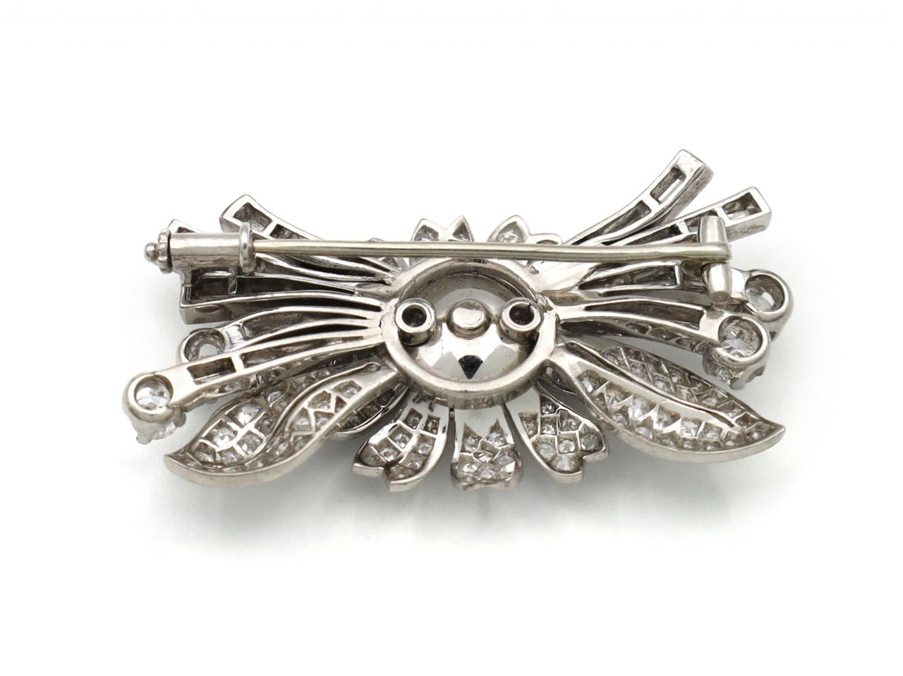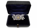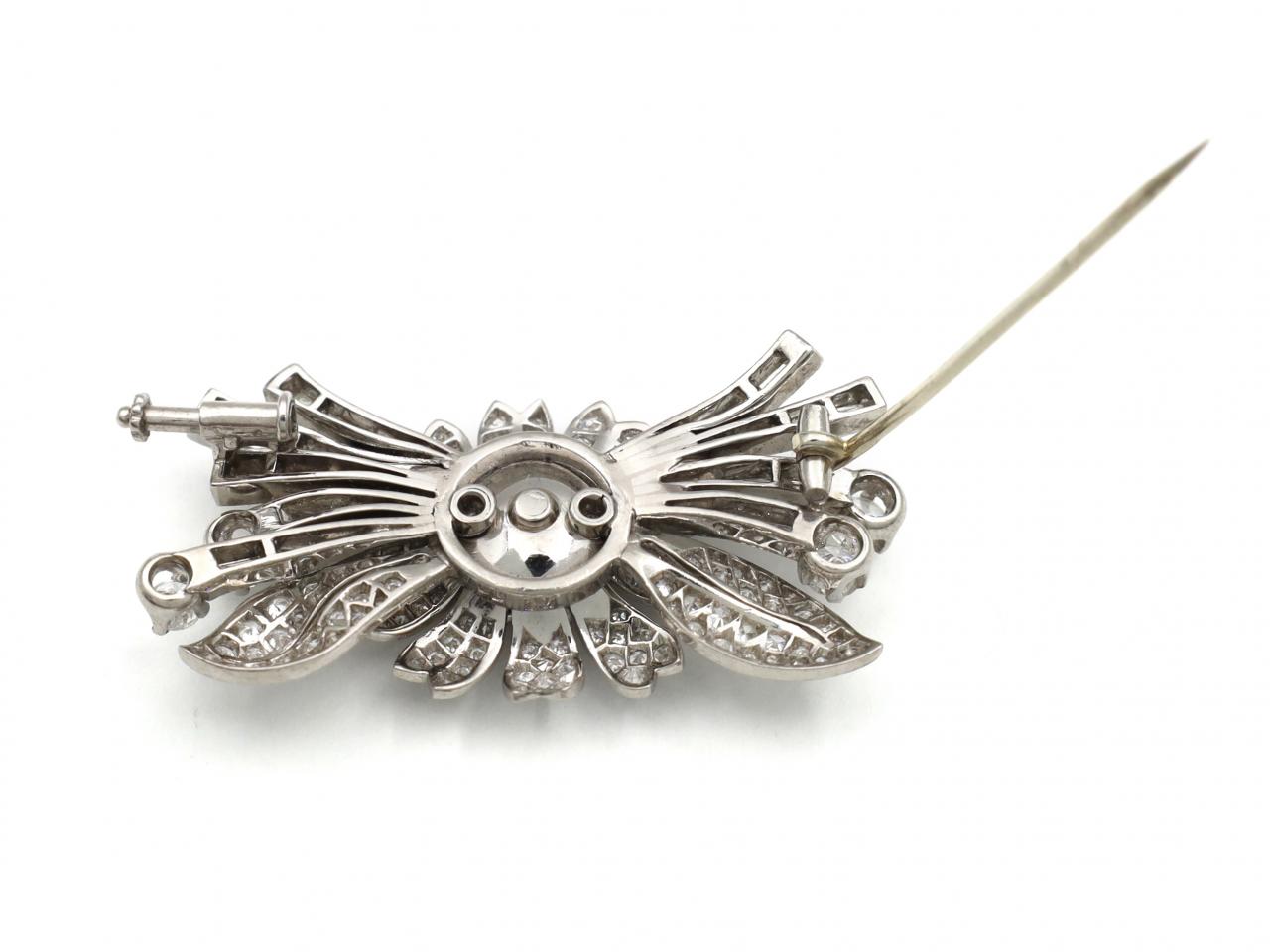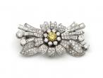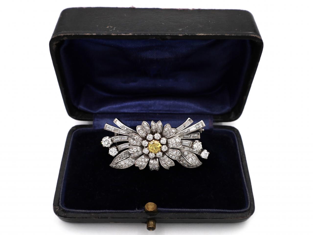 Vintage 1950s fancy yellow diamond and diamond flower brooch in platinum. Centred with an estimated 0.50ct round brilliant cut fancy yellow diamond in a raised claw setting, surrounded and flanked by round brilliant cut diamonds in grain and claw settings and rectangular baguette cut diamonds in channel settings, to a floral motif complete with detailed scalloped petals, openwork leaves and sprawling foliate motifs, fitted to the reverse with a secure hinged pin and safety latch. Marked 18kt gold.