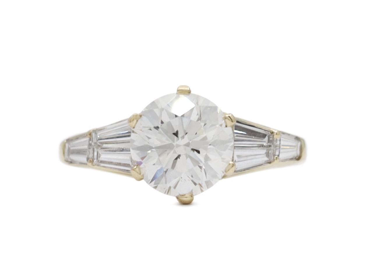 Vintage 2.00ct brilliant cut diamond solitaire engagement ring in 18kt yellow gold. Centrally set with an estimated 2.00ct round brilliantg cut diamond in a claw setting, flanked to either side with six tapering baguette cut diamonds in channel settings, to a stylish flanked solitaire design with intricate settings, curving claws, smooth gallery and terminating to a solid shank. Marked 18kt gold.
