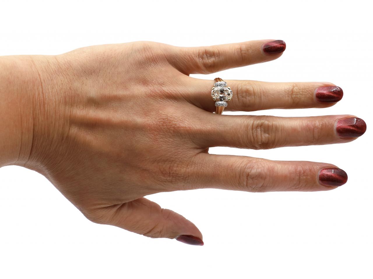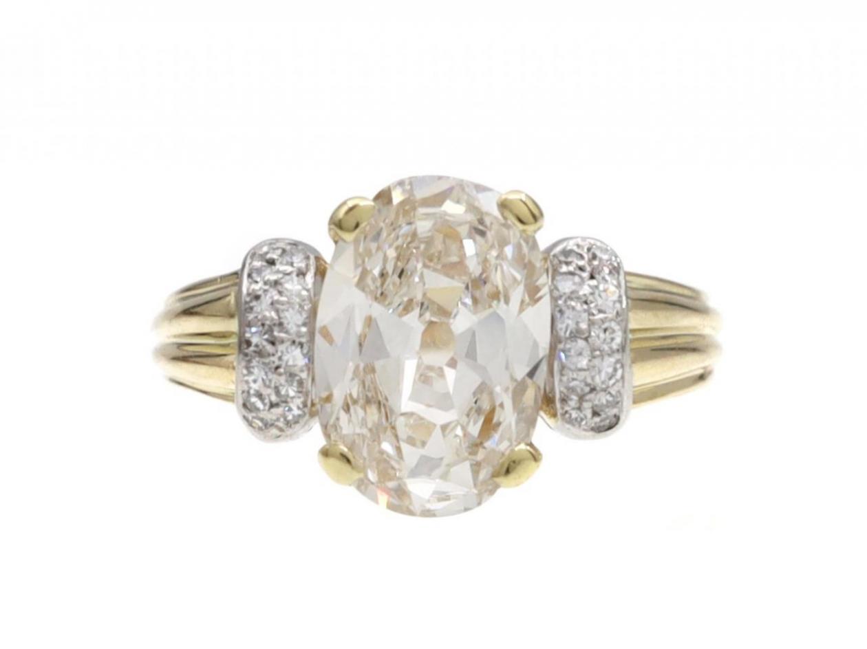 Vintage 2.22ct oval Old Mine cut diamond solitaire engagement ring in 18kt yellow gold. Centred with a 2.22ct oval Old Mine cut diamond, K colour, VS2 clarity in a four claw setting met to either side with semi-circular diamond set terminals and flanked by broad ribbed trumpeting shoulders which taper to a solid shank. Marked 18kt gold. Accompanied by HRD Antwerp certificate.