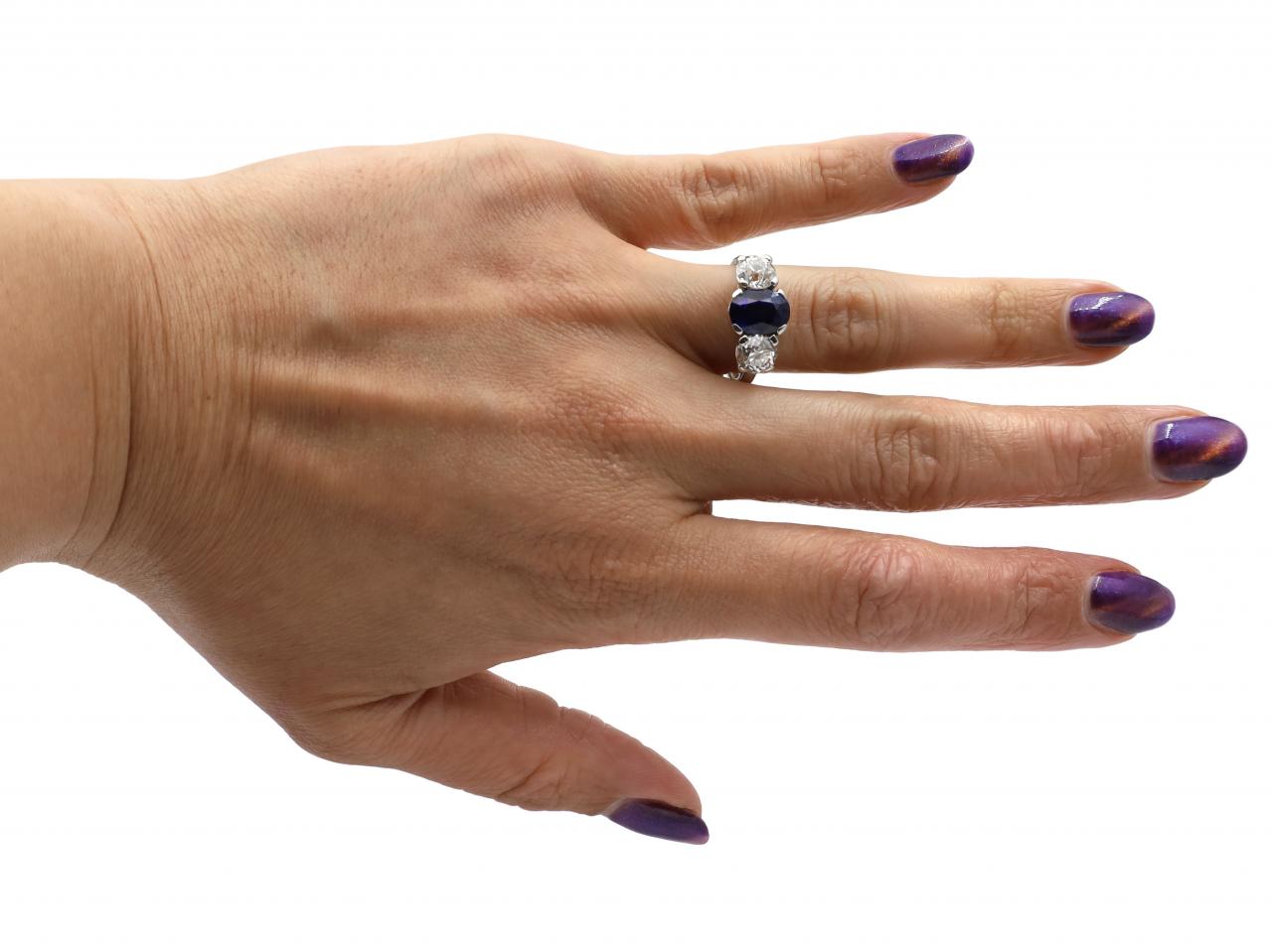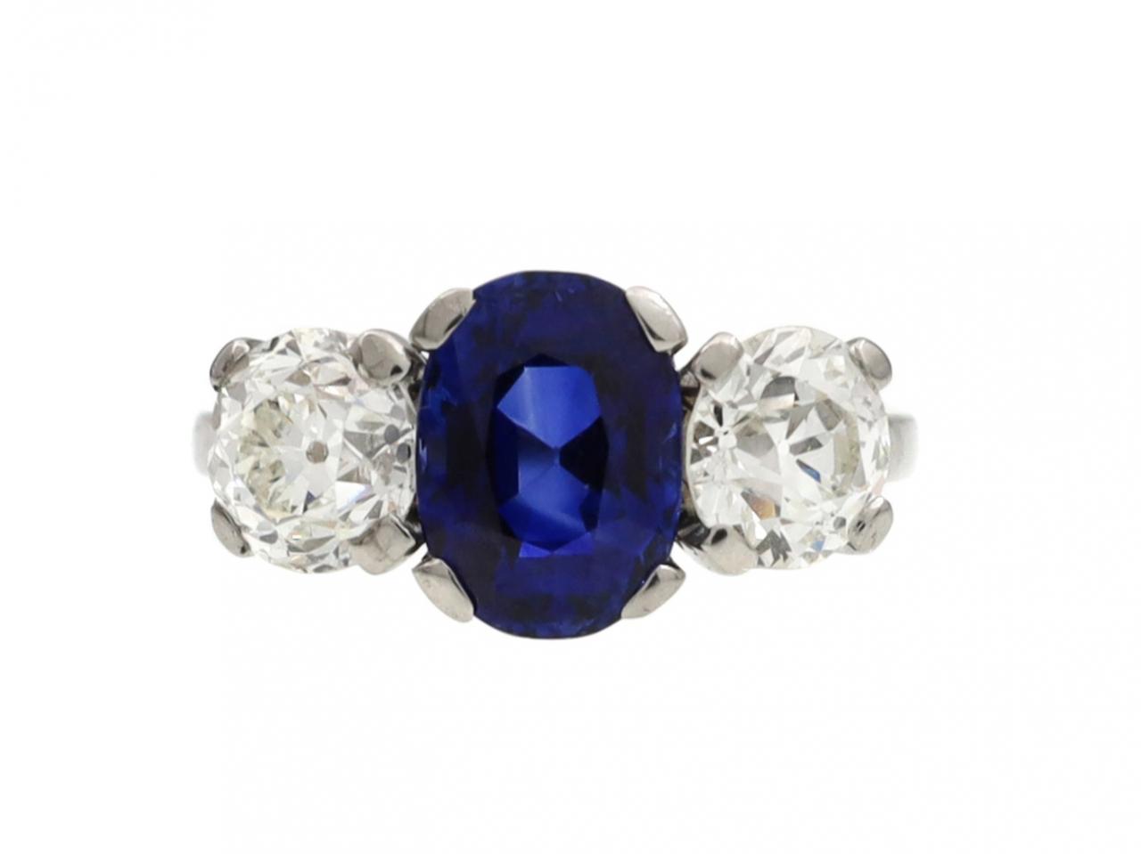 Vintage 2.80ct no heat sapphire and diamond three stone ring in platinum. Centred with an estimated 2.80ct oval mixed cut sapphire with no indication of heat treatment in a raised four claw setting, flanked to either side with two round old European cut diamonds in four claw settings, to a graduating three stone design with curving claws, structured openwork gallery and flanked to either side with raised inwardly tapering shoulders supported by decorative cheniers which continue to a solid shank. Estimated total diamond weight 1.60cts. Marked platinum.
