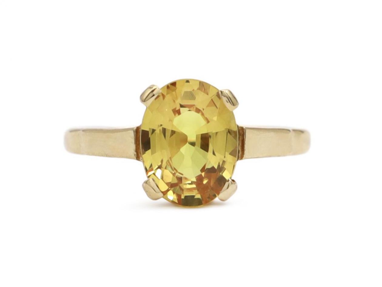 Vintage 2.88ct oval fancy yellow sapphire solitaire ring in 18kt yellow gold. Set with a 2.88ct oval mixed cut fancy yellow sapphire in a four claw setting, to a raised solitaire with curving claws, open collet and fitted to either side with raised shoulders supported by cheniers which smooth to a solid shank. Marked 18kt gold.