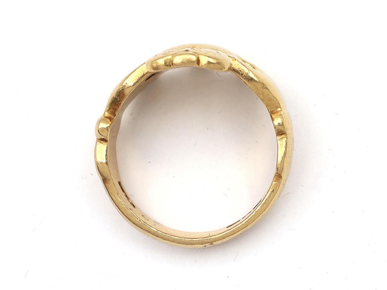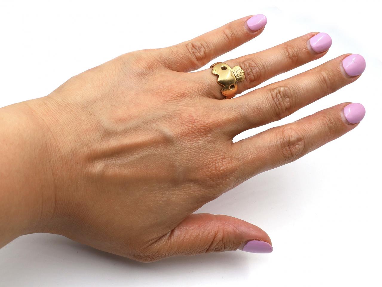 Vintage 22ct yellow gold Claddagh ring engraved 'Till'a the seas gang dry'. Centred with the traditional Claddagh motif, which consists of a crowned heart held by two hands tapering to a solid shank. Engraved to the reverse of the motif in script 'Till'a the seas gang dry'. Hallmarked 22ct gold, Dublin, 1969.