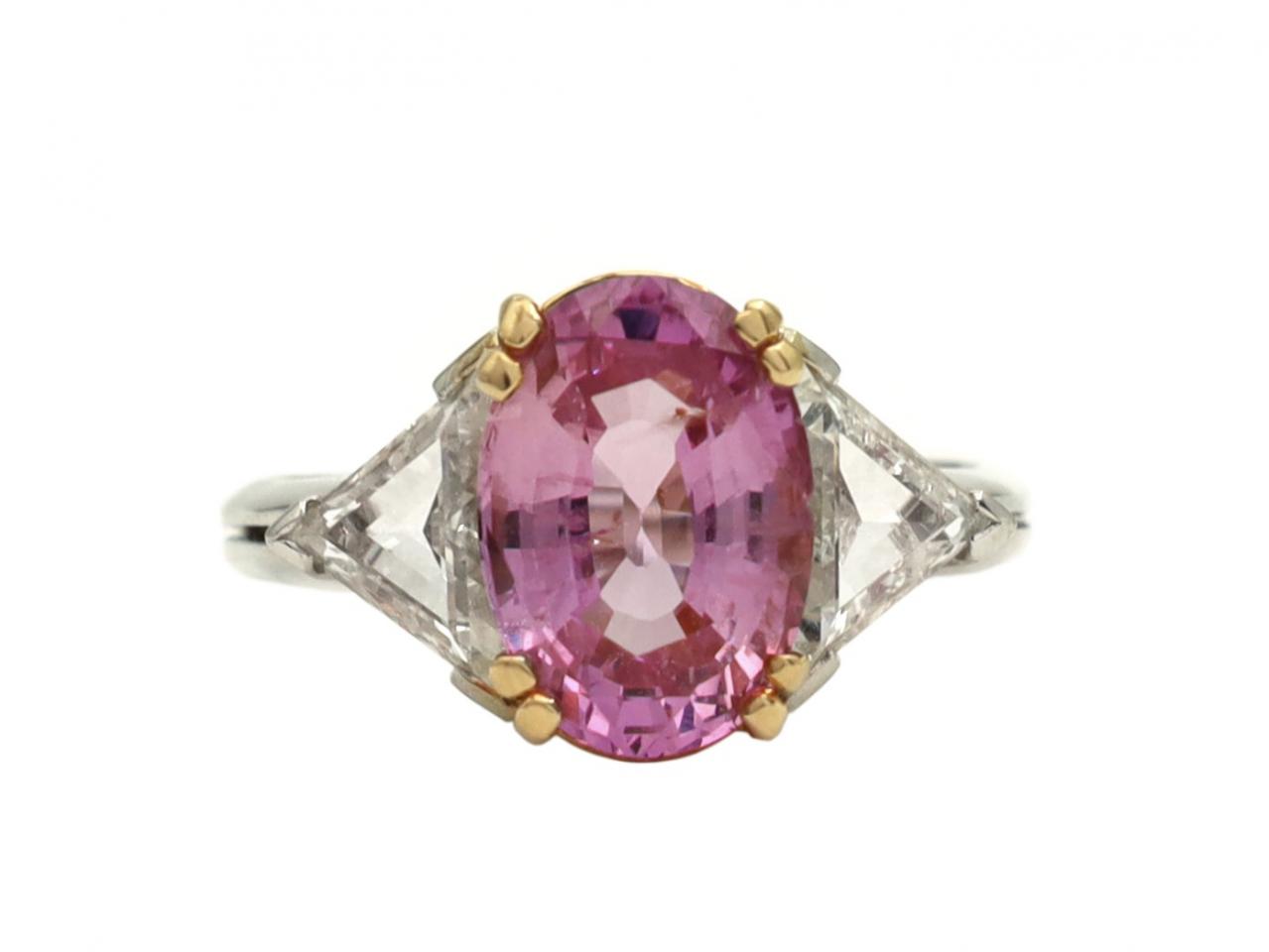 Vintage 3.00ct fancy pink sapphire and trillion diamond ring in platinum. Centred with an estimated 3.00ct oval mixed cut fancy pink sapphire in a yellow gold split claw setting, flanked by two triangular trillion cut diamonds in stylised claw settings, to a striking three stone design with curving claws, pierced linear gallery met to either side with double shanked shoulders which continue and broaden to the reverse.