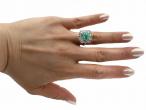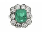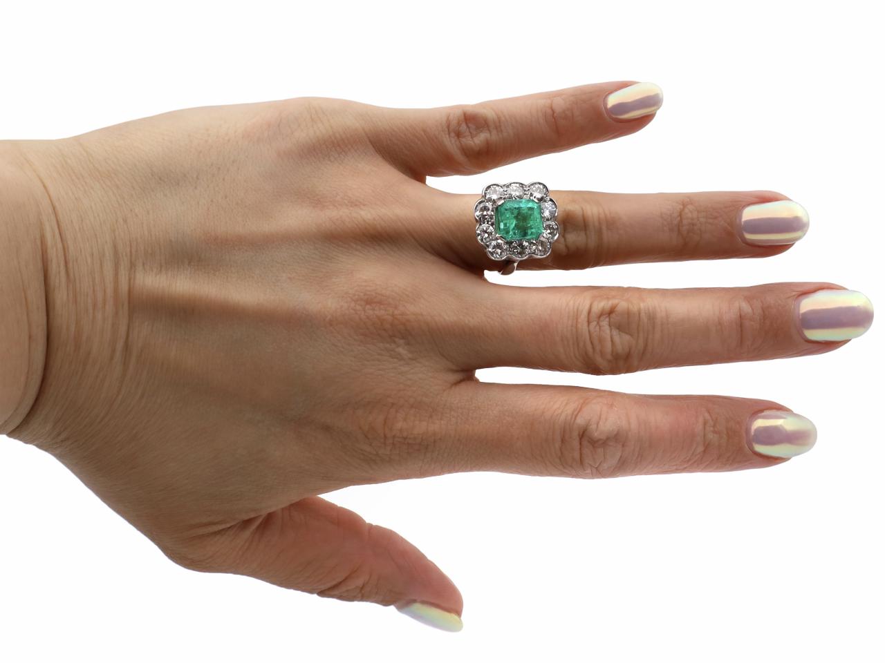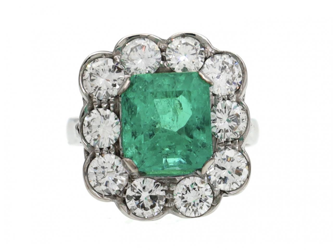 Vintage 3.20ct Colombian emerald and diamond cluster ring in 18kt white gold. Centred with an estimated 3.20ct emerald cut Colombian emerald in a raised four claw setting, surrounded by ten round brilliant cut diamonds in grain and rubover settings, to a large cluster design featuring curving central claws, scalloped edging and open gallery work, the raised inwardly tapering shoulders which continue to the reverse. Estimated total diamond weight 2.00cts.
