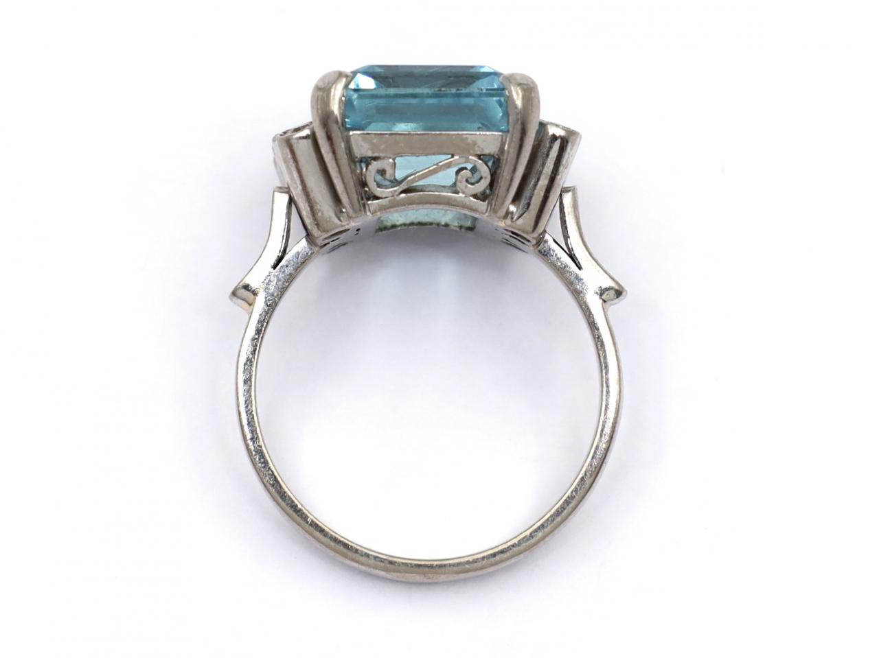 Vintage 7ct aquamarine and diamond dress ring in 18kt white gold. Centrally set with an estimated 7.00ct octagonal step cut aquamarine in a raised four claw setting, flanked to either side with four vertically set round old cut diamonds in circular collets, to a striking cocktail ring design with curving claws, structured gallery and raised shoulders which sweep to a solid shank. Marked 18kt gold.