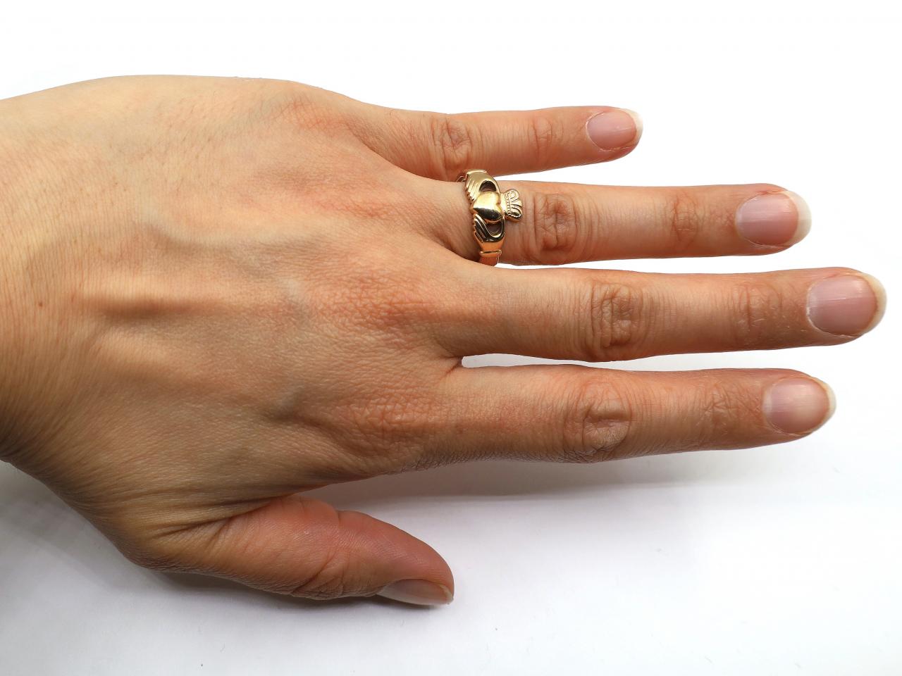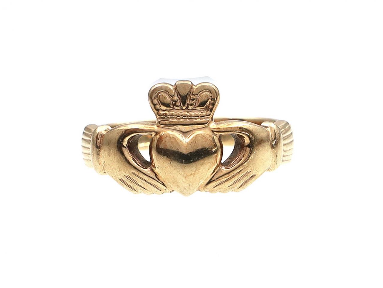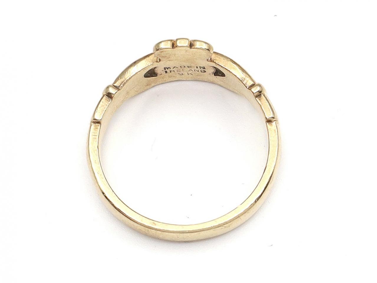 Vintage 9kt yellow gold Claddagh ring. Centred with the traditional Claddagh motif of a crowned heart held by open hands, terminating to a smooth solid shank. Engraved to the inner 'MADE IN IRELAND'. Hallmarked 9kt gold, convention marks.
