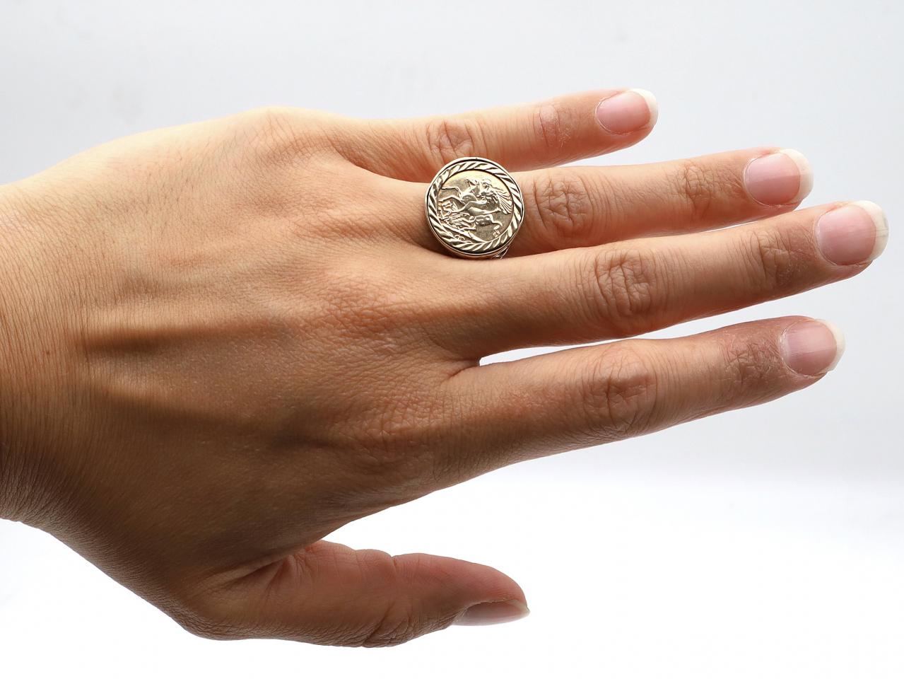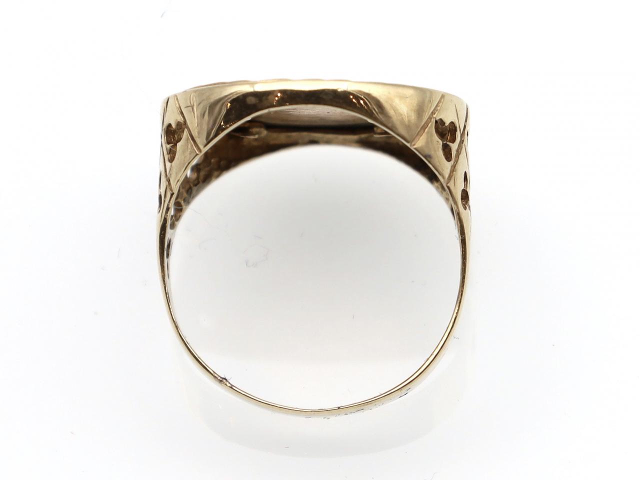 Vintage 9kt yellow gold faux half sovereign coin ring. Centred with a 9kt yellow gold circular plaque featuring a caped St.George atop a galloping horse, slaying a dragon, bordered by a incised diagonal repeating pattern and flanked by broad trumpeting shoulders with pierced clover motifs before smoothing to a solid shank. Marked 9kt gold, Marker's mark 'A&K'.