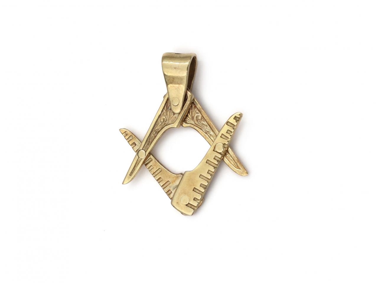 Vintage 9kt yellow gold folding Freemason pendant. A pendant consisting of four tapering panels of textured gold hinged to hide or reveal the Freemason symbol, fitted to top with a chunky tapering bale. Hallmarked 9kt gold, Sheffield.