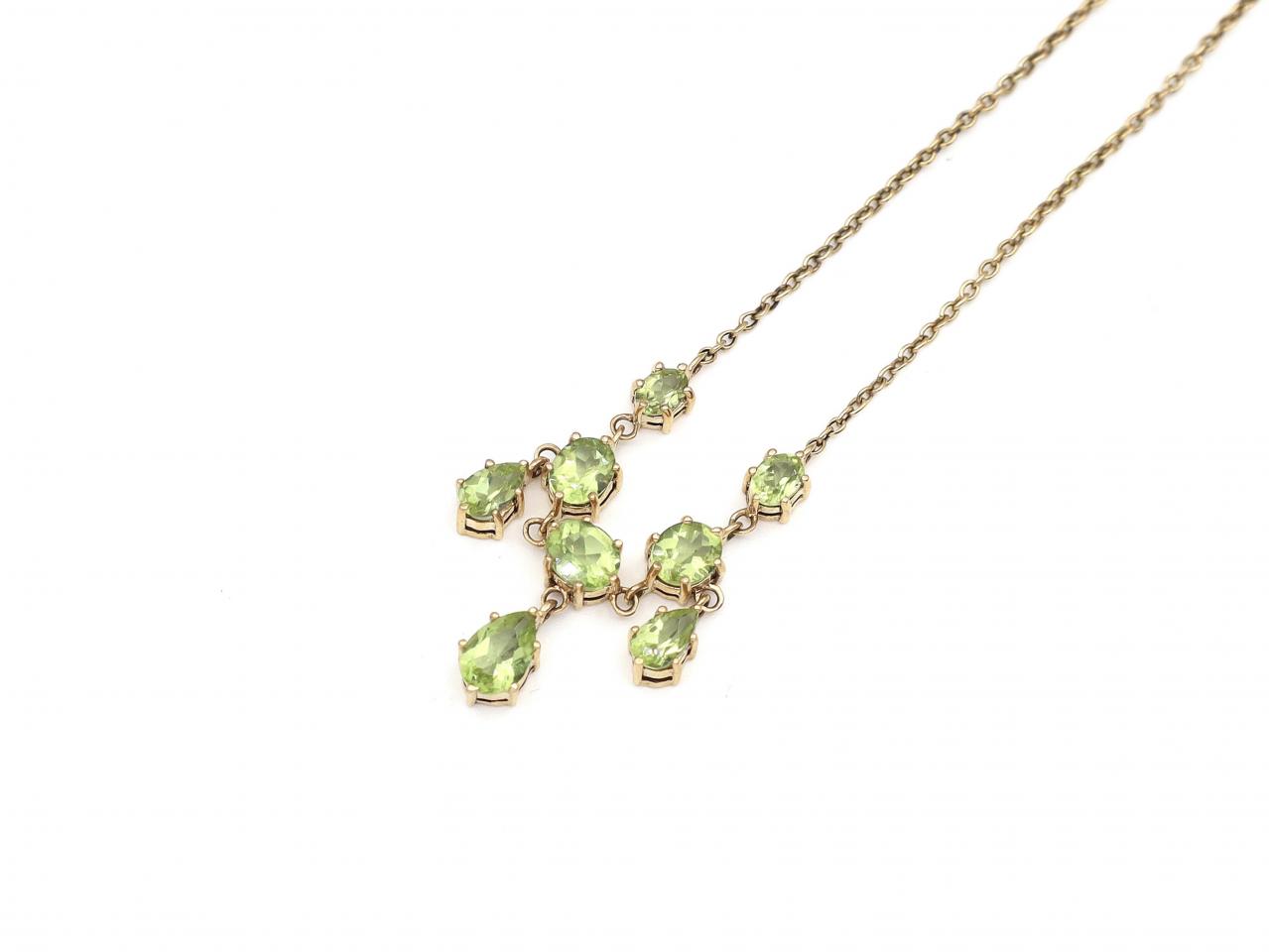Vintage 9kt yellow gold peridot necklace. A trace chain secured to the reverse with a barrel push clasp with hinged figure of eight safety clip, centred with five oval mixed cut peridots in claw settings, suspending three pear mixed cut peridots in claw collets flowing with movement. Hallmarked 9kt gold.