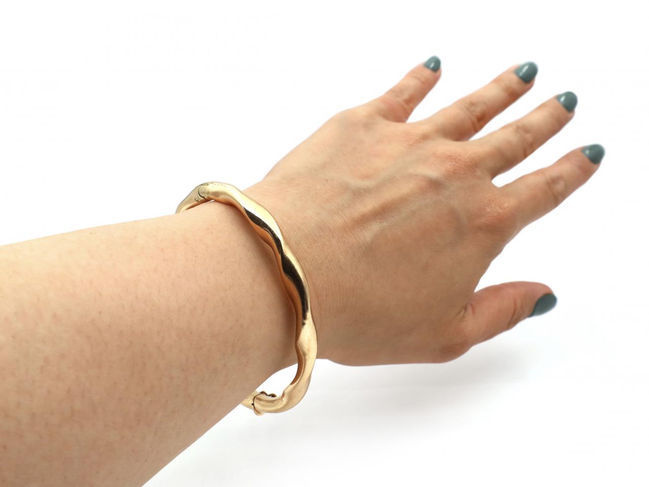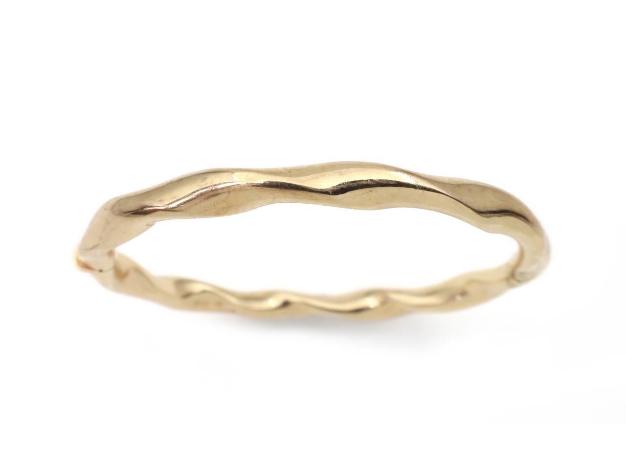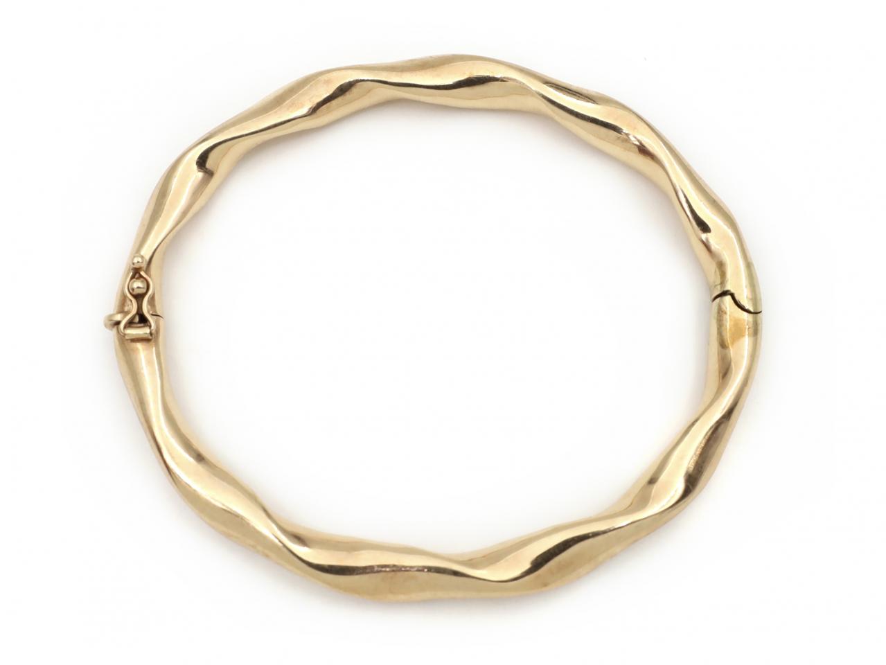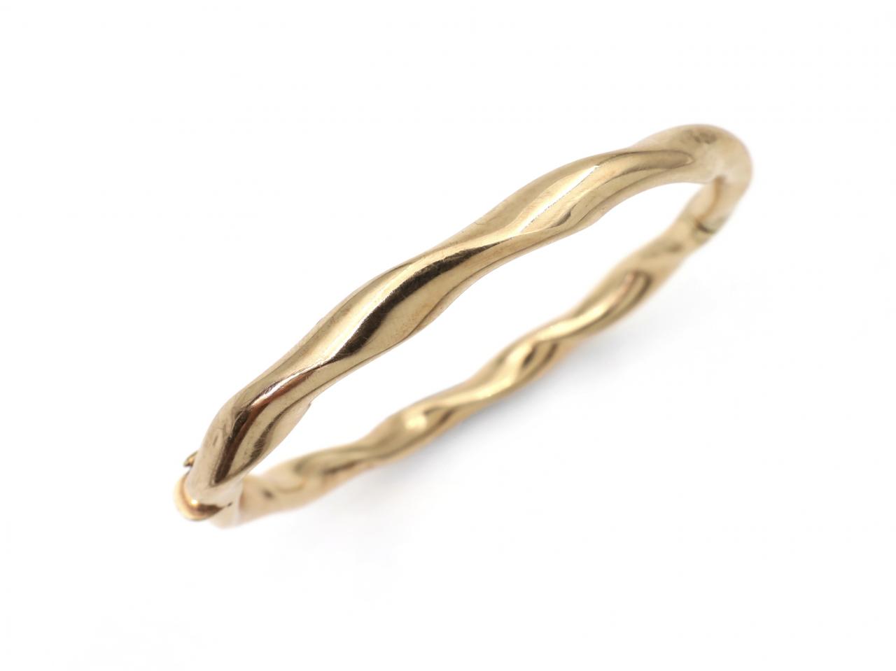Vintage 9kt yellow gold soft twist hinged bangle. A hollow hinged bangle featuring a soft polished twist, a secure double push clasp and hinged safety latch. Marked 9kt gold.