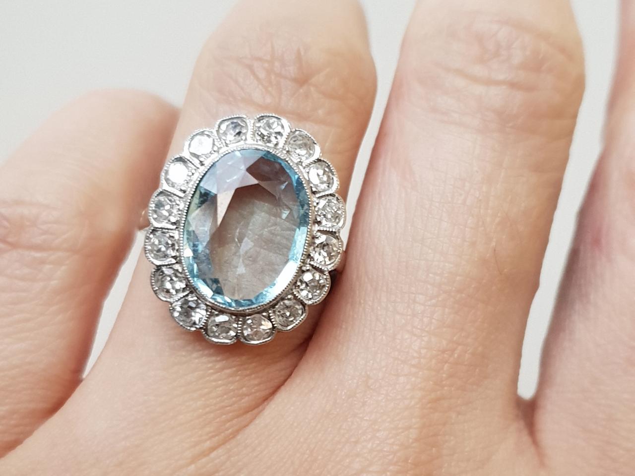 Vintage aquamarine and diamond floral cluster ring in 18kt white gold. Centrally set with an oval mixed cut aquamarine in a millegrain setting, encircled by sixteen cushion shape Old Mine cut diamonds in grain and millegrain settings, to an impressive low laying cluster design, featuring smooth settings, scalloped edging, pierced open gallery with scrolling motifs and met to either side with raised trumpeting shoulders supported by cheniers which terminate to incised double ribbing before curving to a solid shank. Estimated total diamond weight 0.80cts.