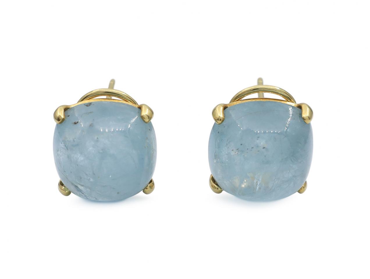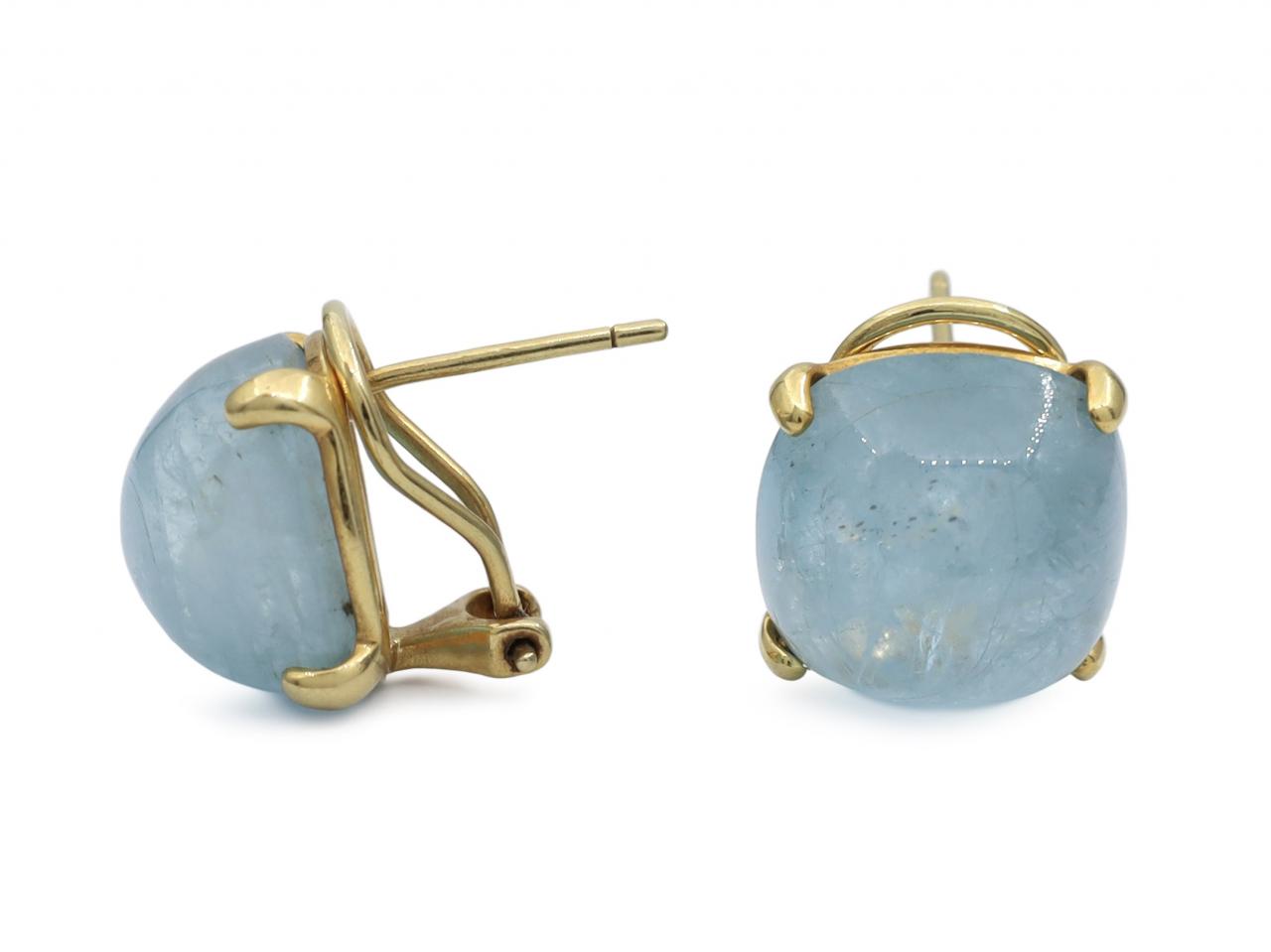 Vintage cabochon aquamarine earrings in 18kt yellow gold. A matching pair of earrings, each set with a cushion shape cabochon cut aquamarine in a four claw setting, fitted to the reverse with a secure post and omega clip backing. Hallmarked 18kt gold, London.