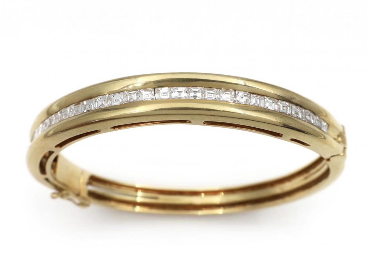 Vintage carre cut diamond hinged bangle in 18kt yellow gold. A hinged bangle featuring a double row to the reverse and set to the front with thirty two square carre cut diamonds in channel settings featuring thick tubular borders and pierced gallery, fitted to the side with a secure push clasp mechanism and safety latch. Estimated total diamond weight 4.00cts. Hallmarked 18kt gold, French import marks.
