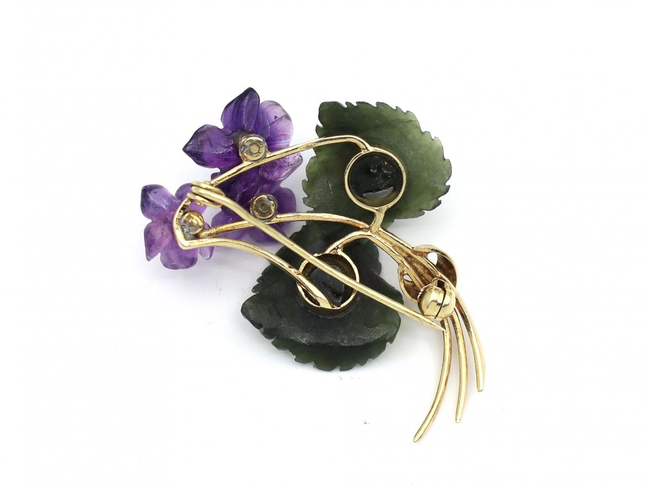 Vintage carved amethyst, nephrite and diamond bouquet brooch in yellow gold. A pretty bouquet brooch consisting of three carved amethyst flowers, centred with a round claw set diamond, each connected to a curveing yellow gold stem and decorated with two carved nephrite jade leaves, fitted to reverse with a secure hinged pin and safety closure.