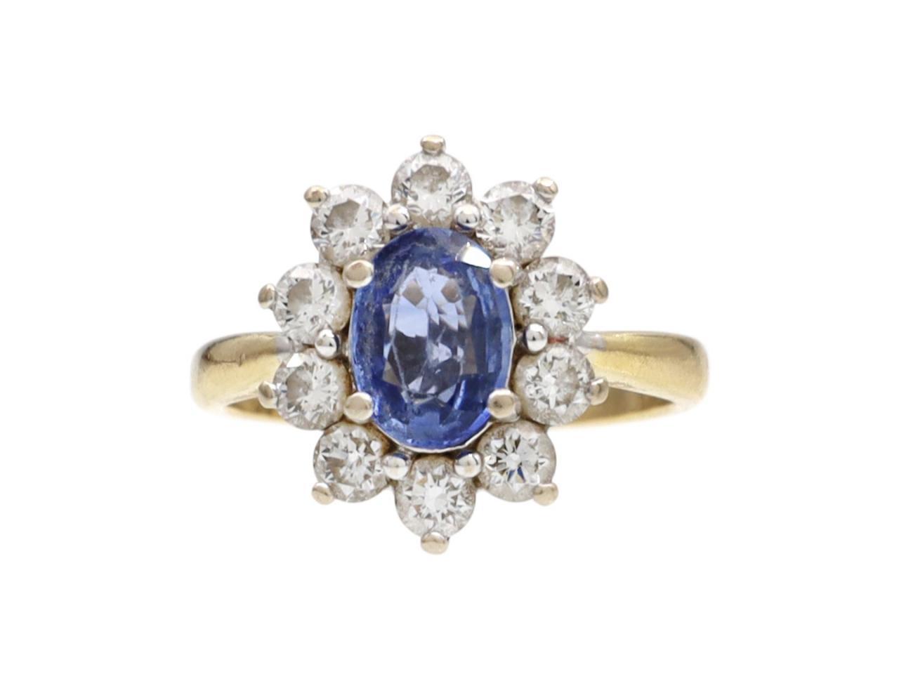 Vintage Ceylon sapphire and diamond coronet cluster ring in 18kt yellow gold. Centred with an oval mixed cut sapphire in a four claw setting, surrounded by a row of round brilliant cut diamonds in claw settings, to an oval cluster with curving claws, open wirework gallery and flanked to either side with raised inwardly tapering shoulders which curve to a solid shank.