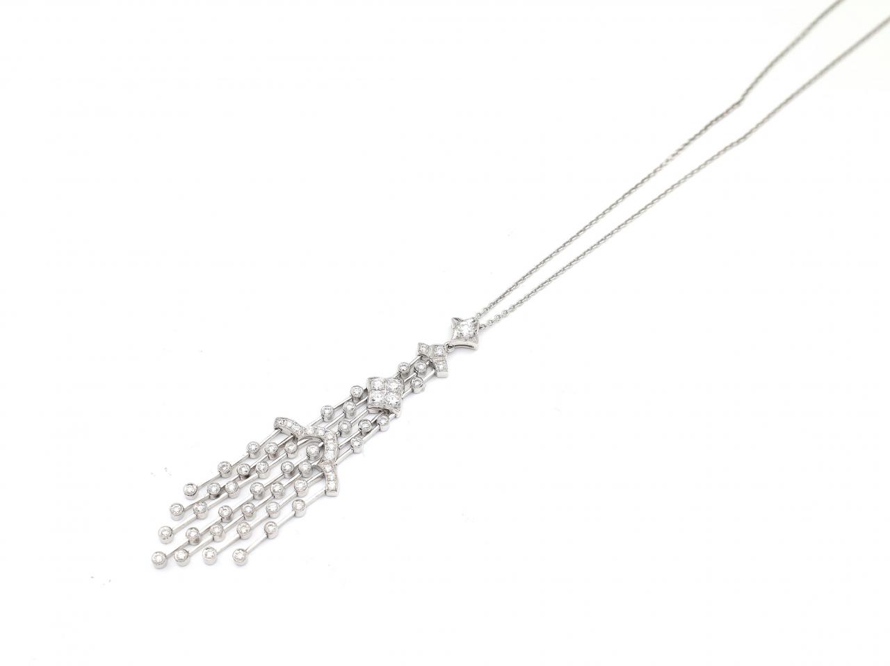 Vintage Chandelier pendant set with diamonds in 18kt white gold. A fine trace chain in 18kt white gold with a blot ring closure, suspending an articulated fringe pendant set with round brilliant cut diamonds in garinf and rubover settings.