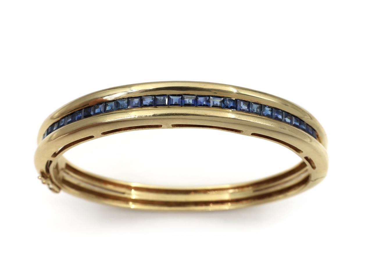 Vintage channel set sapphire hinged bangle in 18kt yellow gold. A hinged bangle featuring a double row to the reverse and set to the front with twenty seven square step cut sapphires in channel settings featuring thick tubular borders and pierced gallery, fitted to the side with a secure push clasp mechanism and safety latch. Hallmarked 18kt gold, French import marks.