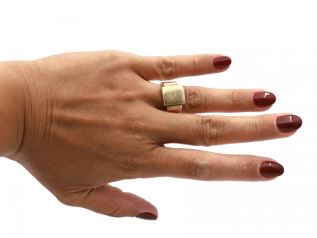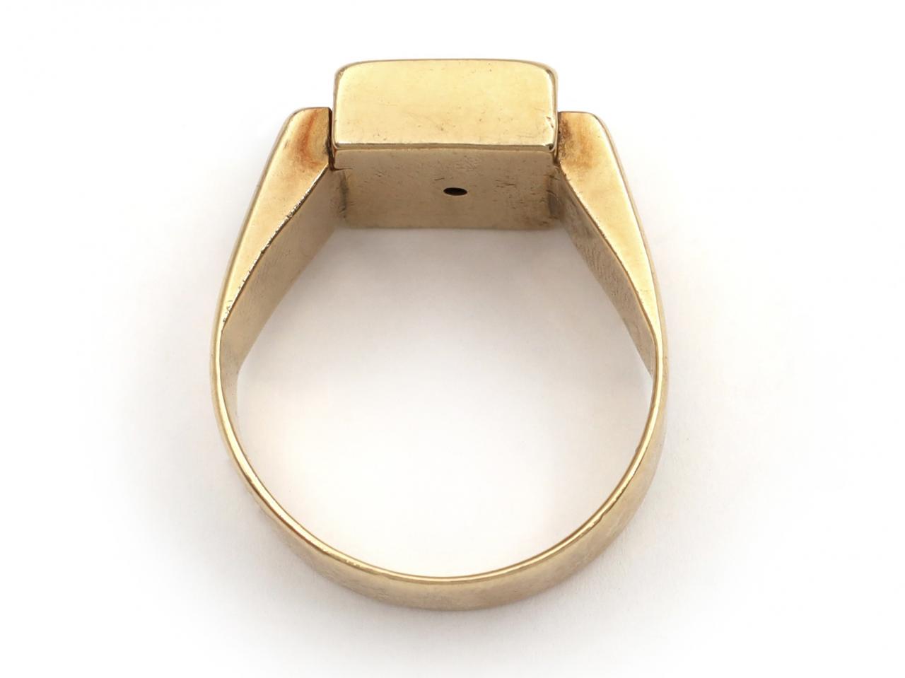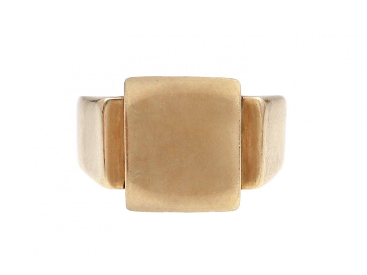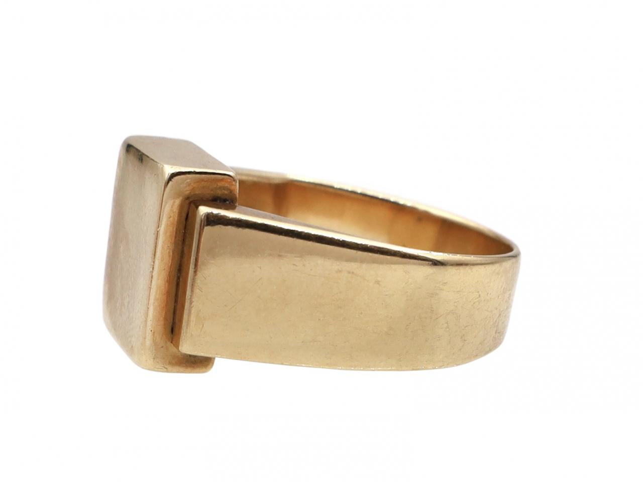 Vintage chunky rectangular signet ring in 18kt yellow gold. Centred with a hollow rectangular plaque met to either side with broad step down square shoulders which taper to a solid shank. Hallmarked 18kt gold, French.
