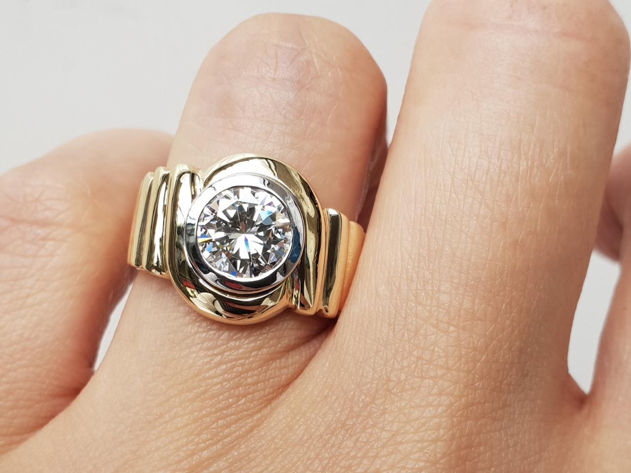 Vintage chunky ribbed 1.30ct diamond solitaire ring in 18kt yellow gold. Set with an estimated 1.30ct round brilliant cut diamonds in a polished rubover setting, to a chunky solitaire design with ribbed twisted border and shoulders which taper and smooth to a solid shank. Hallmarked 18kt gold, Italian.