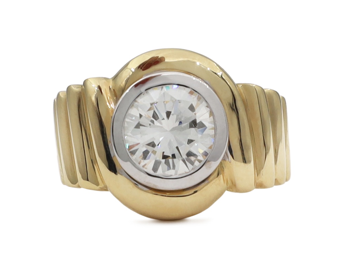 Vintage chunky ribbed 1.30ct diamond solitaire ring in 18kt yellow gold. Set with an estimated 1.30ct round brilliant cut diamonds in a polished rubover setting, to a chunky solitaire design with ribbed twisted border and shoulders which taper and smooth to a solid shank. Hallmarked 18kt gold, Italian.