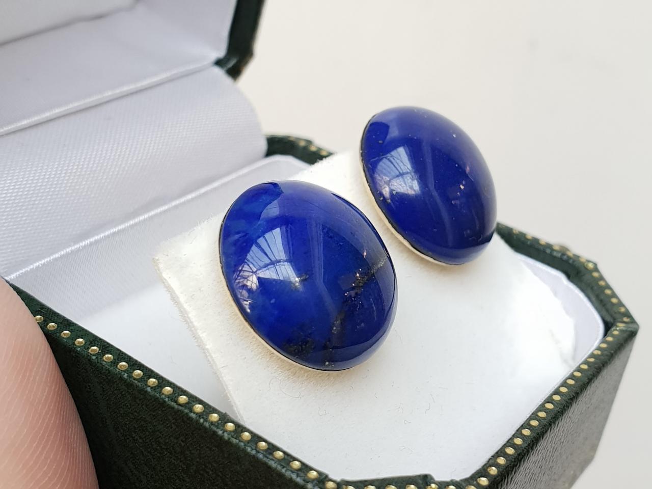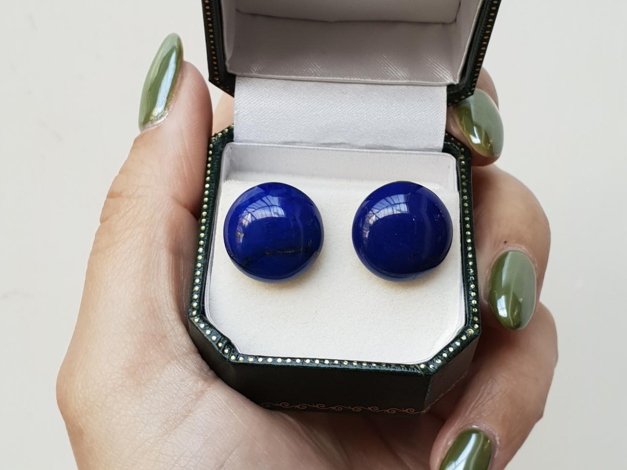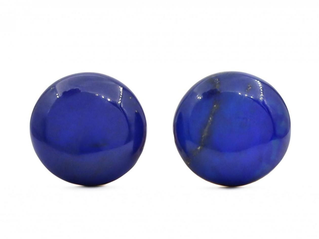 Vintage circular domed lapis lazuli stud earrings in 14kt gold. A matching pair of earrings, each set with a round cabochon cut lapis lazuli in an invisible setting, fitted to the reverse with a secure post and butterfly fitting. Tested 14kt gold.