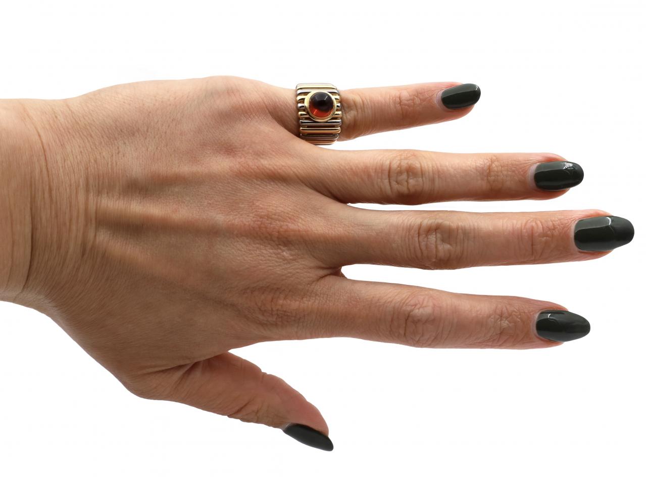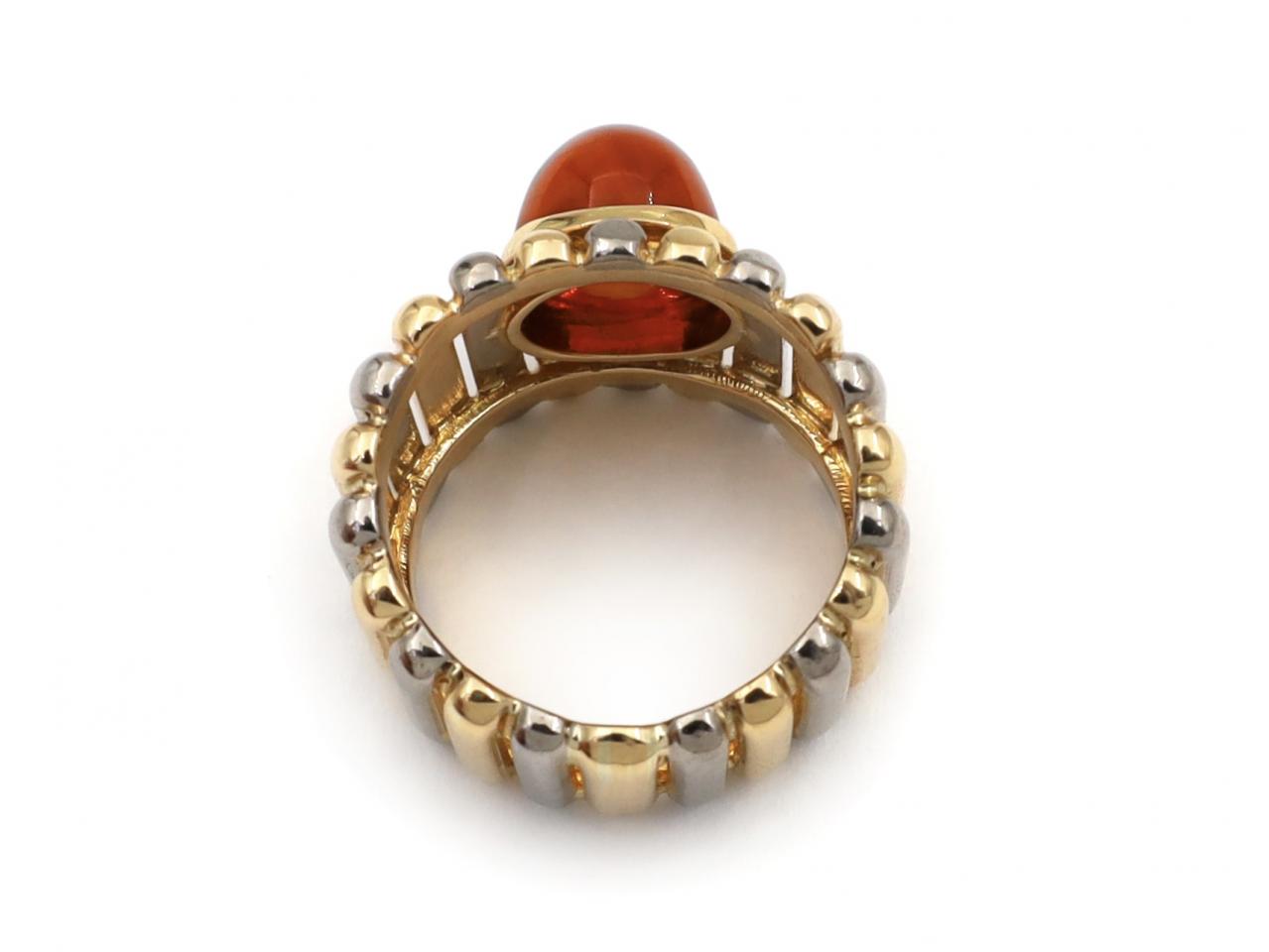 Vintage citrine cabochon and two tone linear 18kt gold ring. Set with a round cabochon cut citrine in a polished rubover setting, to an openwork linear ring featuring alternating white and yellow gold batons which taper to the reverse. Hallmarked 18kt gold, Italian. Cannot be re-sized.