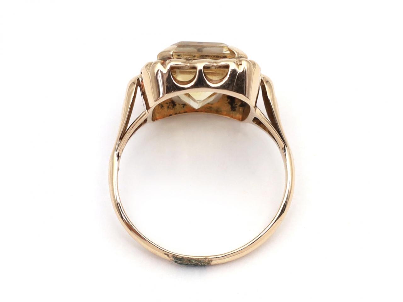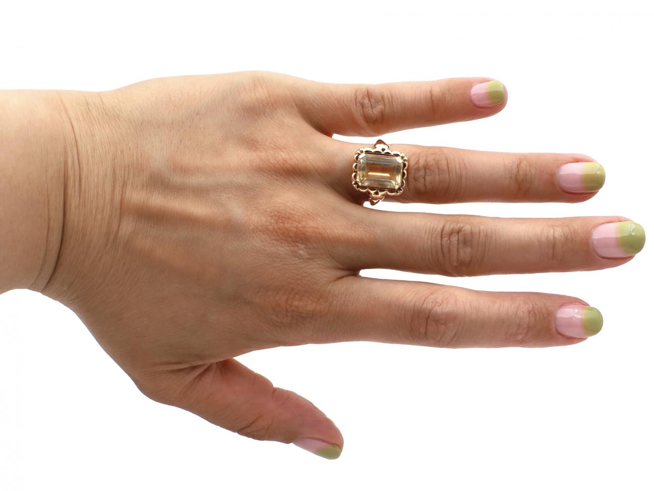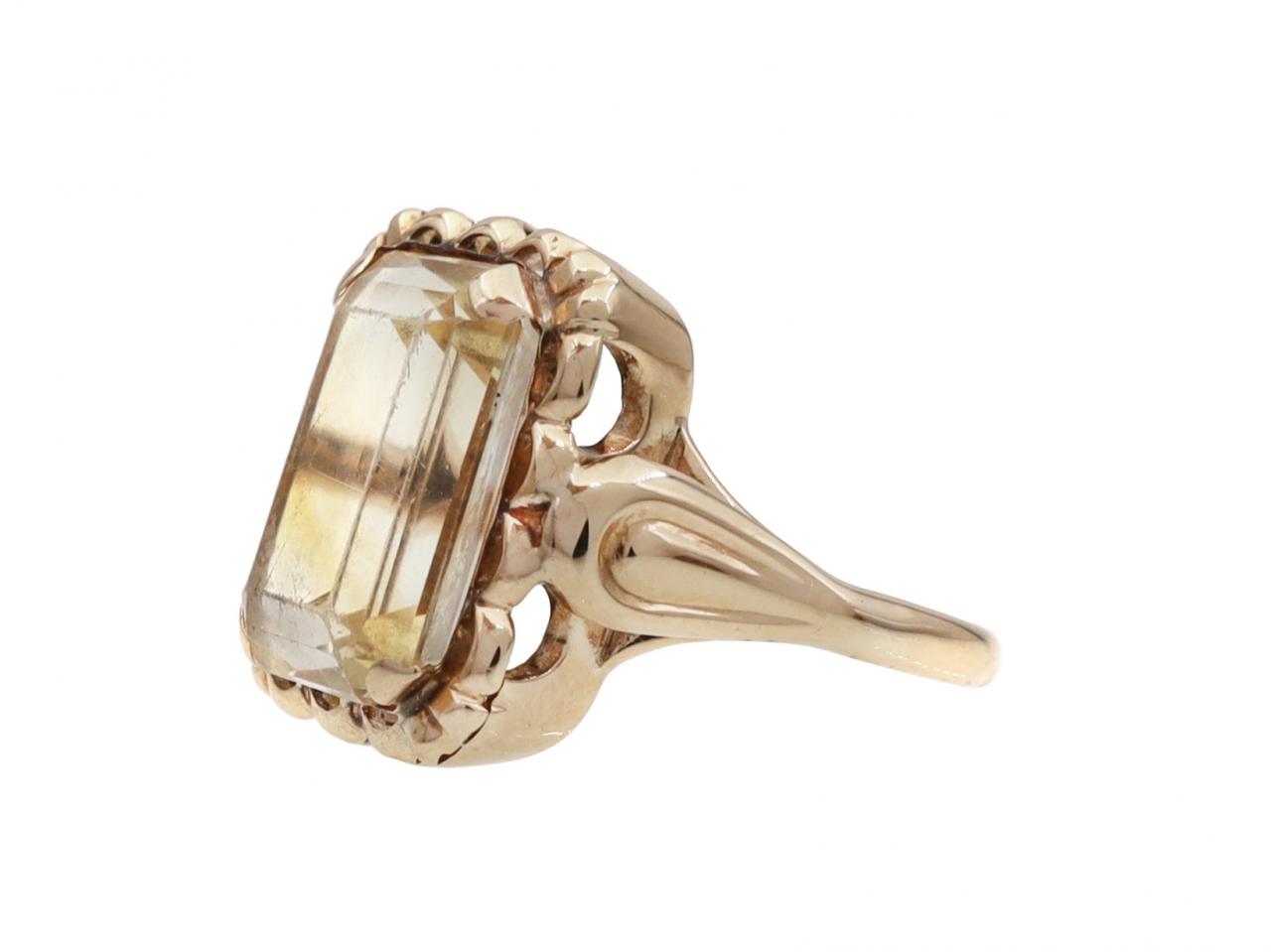 Vintage citrine cocktail ring in 14kt yellow gold. Centrally set with an octagonal emerald cut citrine in a four claw setting, to a solitaire dress ring design with scalloped decorative frame pierced gallery and raised trumpeting shoulders which taper to a solid shank. Hallmarked 14kt gold, Finnish.