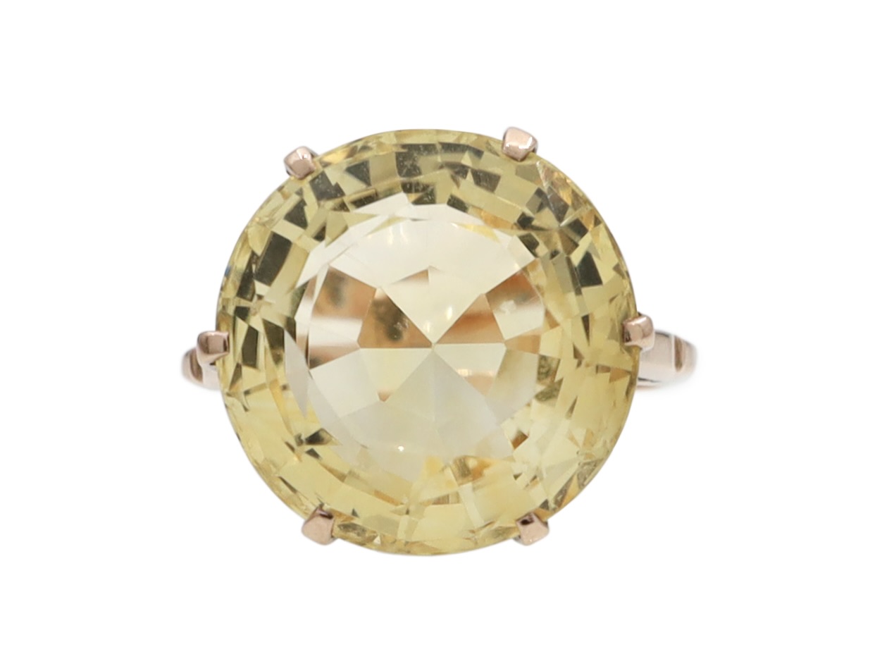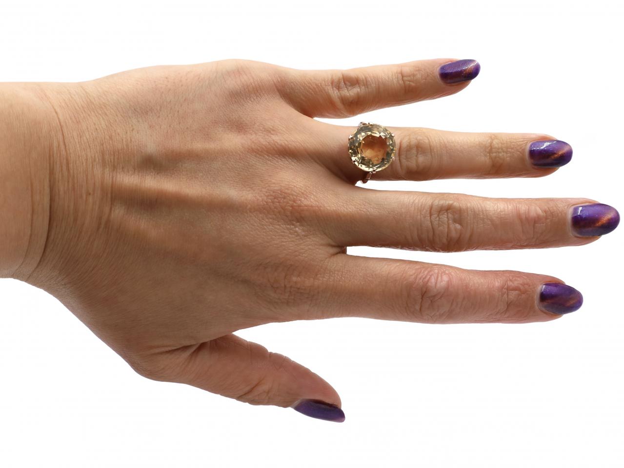 Vintage citrine dress ring in 14kt rose gold. Centrally set with a round fancy cut citrine in a circular claw set collet, featuring elaborately pierced open details, flanked to either side with raised inwardly tapering shoulders supported by cheniers, ribbed terminals and smooth champfered shank.