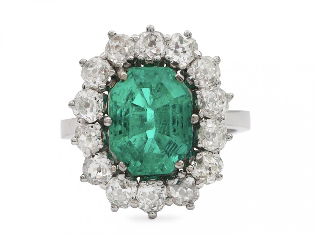 Vintage Colombian emerald and diamond coronet cluster ring in 18kt white gold. Centrally set with an octagonal emerald-cut Colombian emerald in a raised claw setting, encircled by a row of fourteen cushion shape Old Mine cut diamonds in claw settings, to an impressive cluster ring with wirework gallery and met to either side with square shoulders which continue to a solid shank. Estimated total diamond weight 2.00cts.