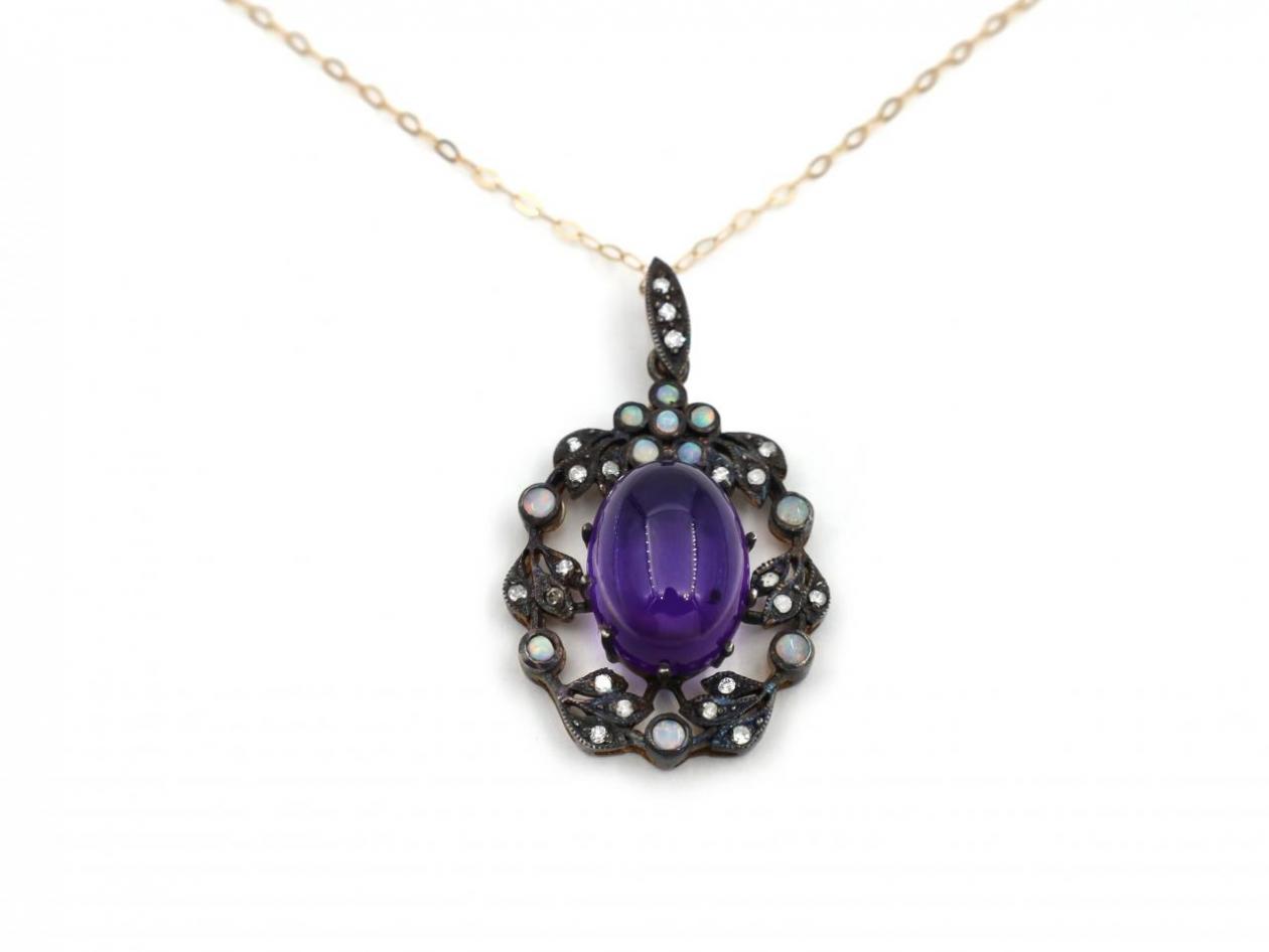 Vintage costume amethyst and opal pendant on yellow gold chain. A costume pendant featuring an oval cabochon cut amethyst in a claw setting, to an openwork wreath pendant decorated with cubic zirconia and opals, suspended from a 9kt yellow gold trace chain.