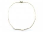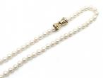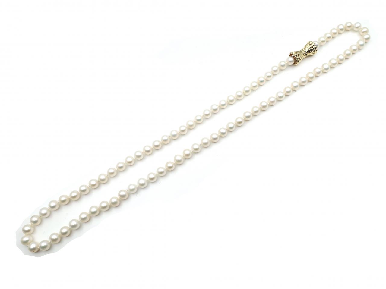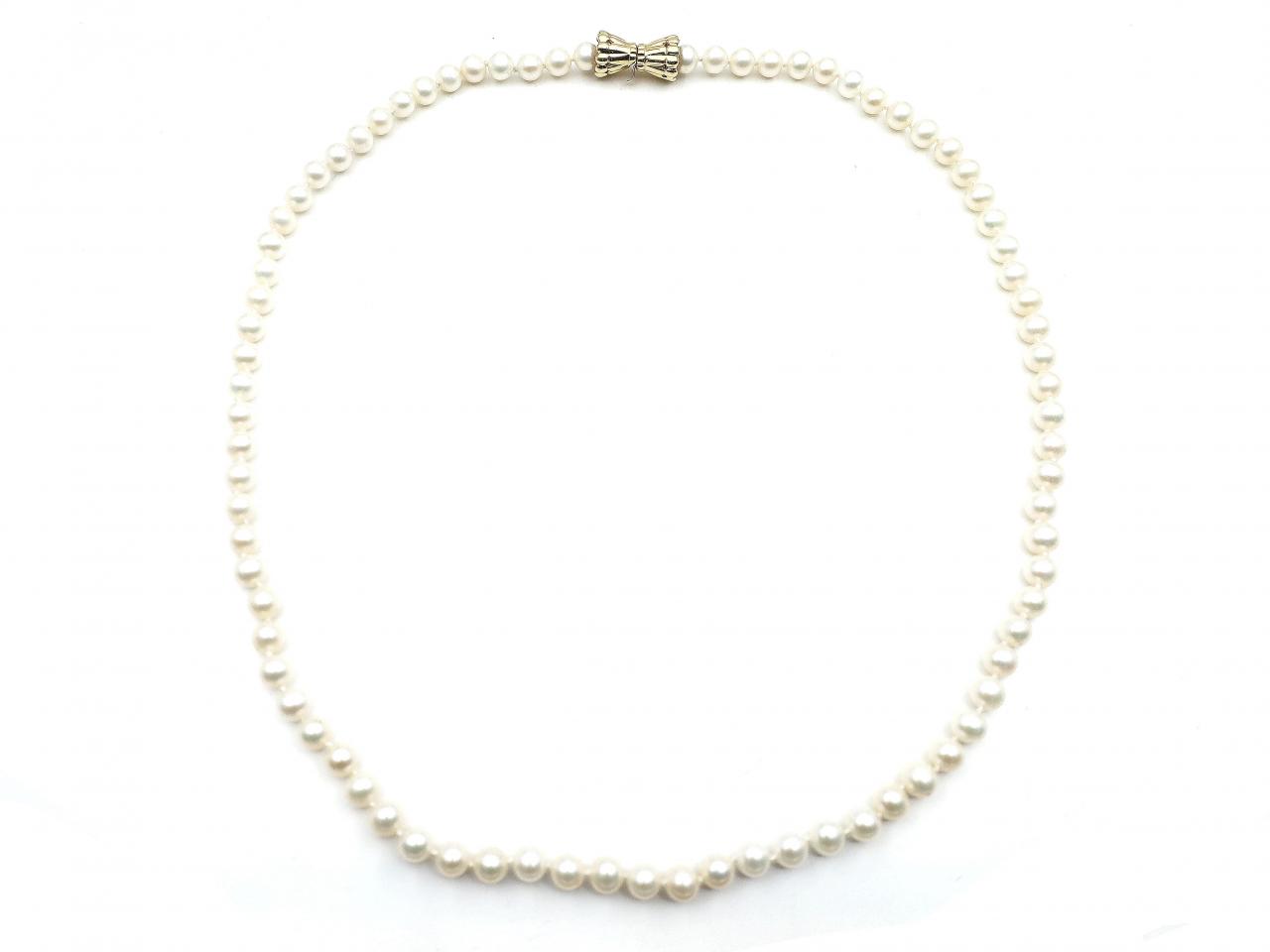 Vintage cultured pearl necklace with a yellow gold bow clasp.
