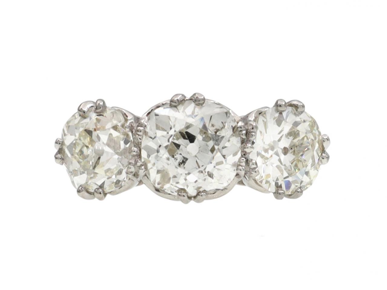 Vintage cushion shape three stone diamond engagement ring in platinum. Centred with an estimated 2.40ct cushion shape Old Mine cut diamond in a fancy split claw setting, flanked by an estimated 1.40ct cushion shape Old Mine cut diamond in a split claw setting and an estimated 1.30ct cushion shape Old Mine cut diamond in a split claw setting, to a graduating three stone design with curving claws, pierced and scrolling openwork gallery and met to either side with fine shoulders which flow to a solid shank.