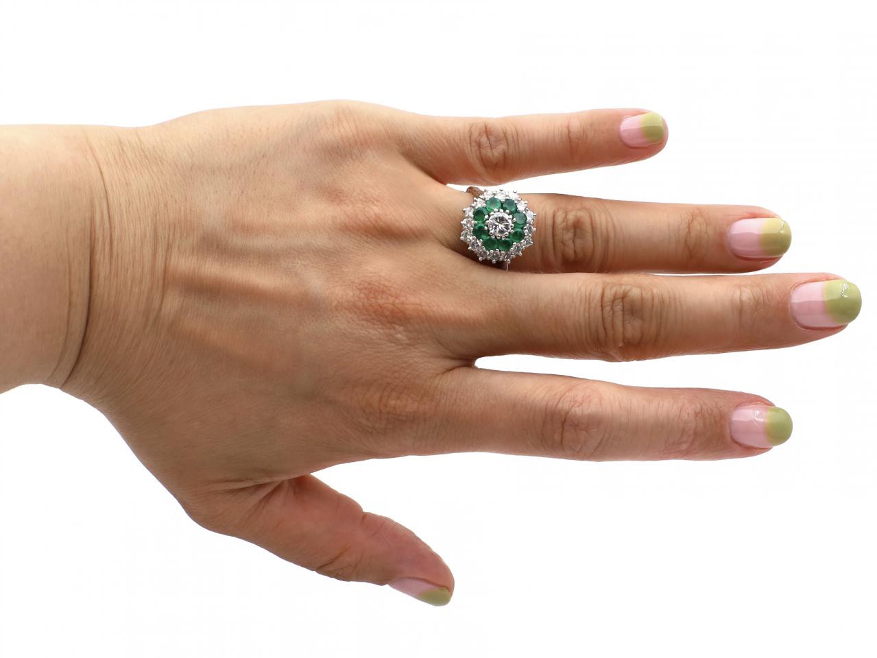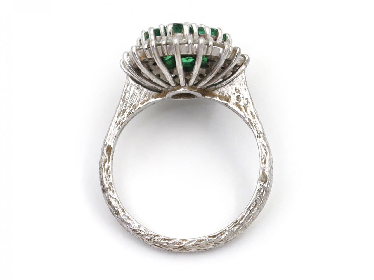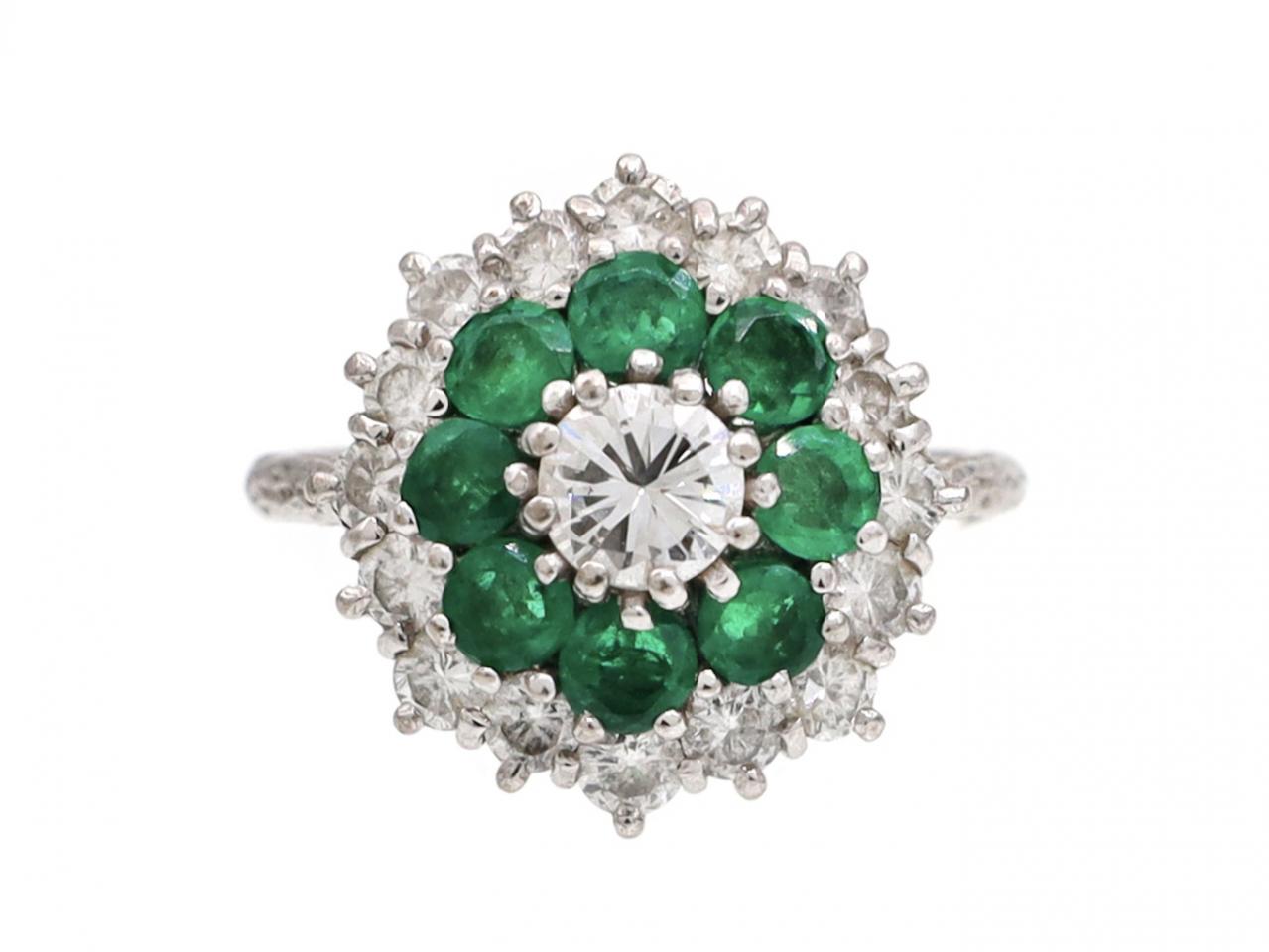 Vintage diamond and emerald target cluster ring in 18kt white gold. Centrally set with an estimated 0.35ct round brilliant cut diamond in a claw setting, encircled by a row of round mixed cut emeralds in raised claw settings, further enhanced by a row of round brilliant cut diamonds in claw settings, to a double row cluster design with curving claws, open wirework gallery and met to either side with raised inwardly tapering shoulders with textured florentine finish which continues to the reverse. Marked 18kt gold.