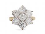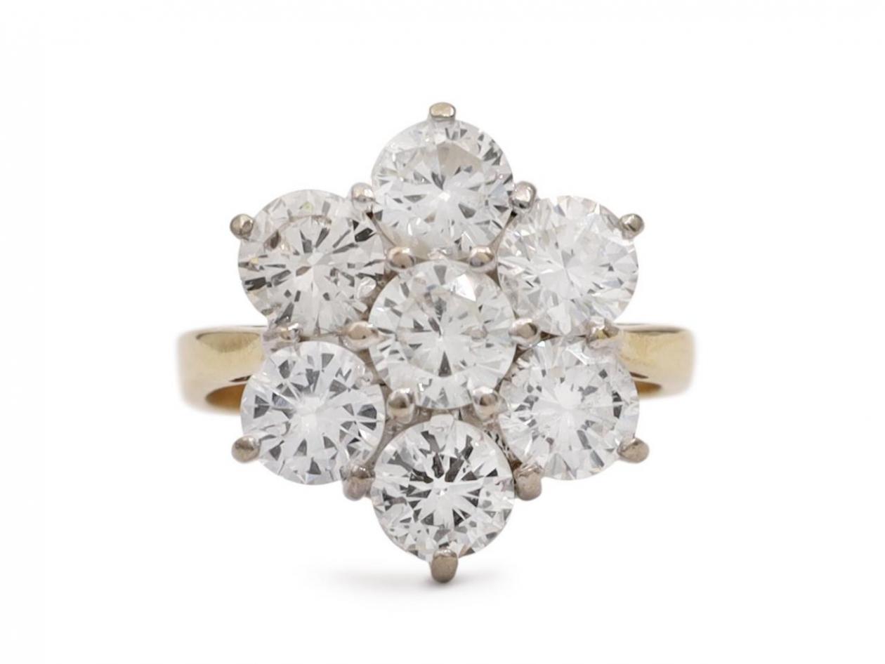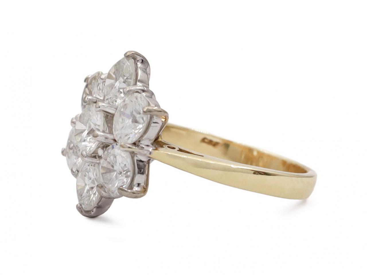Vintage diamond daisy cluster engagement ring in 18kt yellow gold. Set with seven round brilliant cut diamonds in white claw settings, to a floral cluster design featuring curving claws, raised and pierced gallery and met to either side with inwardly tapering shoulders supported by cheniers before flowing to a solid shank. Estimated total diamond weight 2.40cts. Hallmarked 18kt gold.