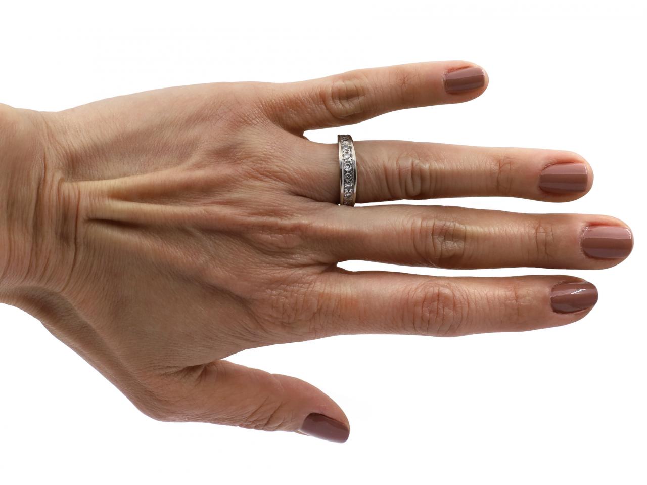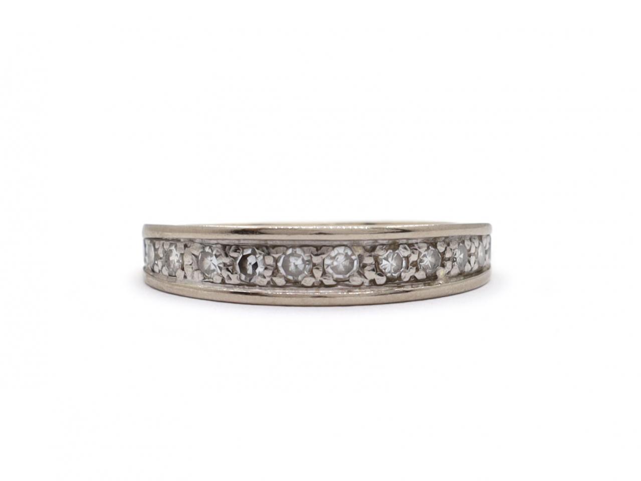 Vintage diamond half eternity ring in 18kt white and yellow gold. Set across the finger with twelve round eight cut diamonds in grain settings, to a half eternity design featuring raised curved borders and tapered integrated shoulders with ribbed details before continuing to a solid shank.
