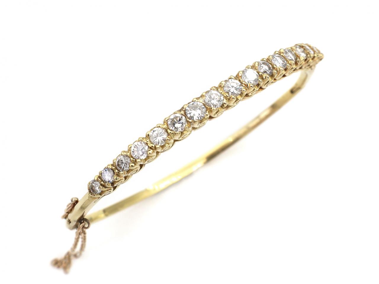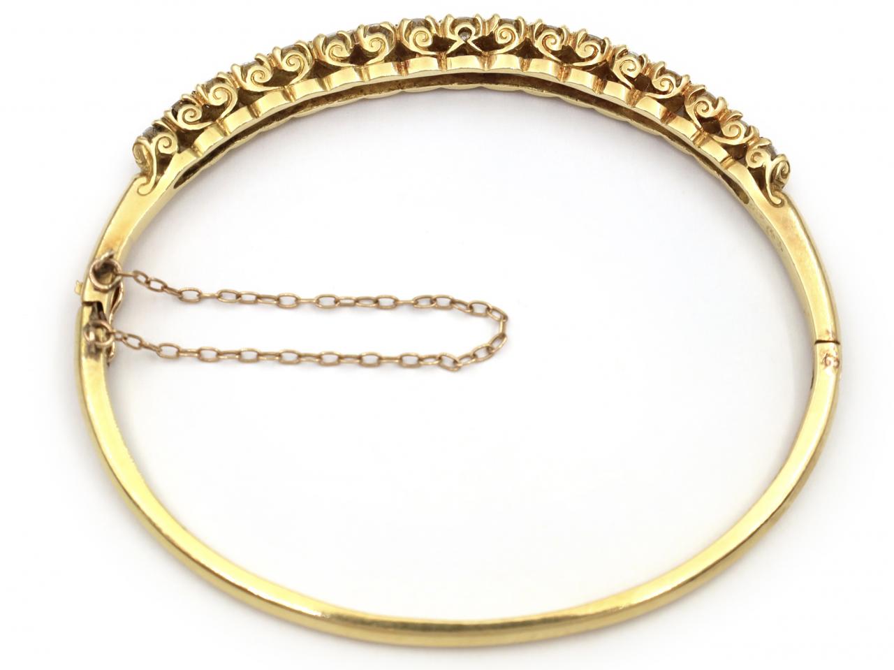 Vintage diamond set carved hinged bangle in 18kt yellow gold. Set across the top with seventeen round brilliant cut diamonds in fancy claw settings, to a hinged bangle with a champfered polished reverse and a graduating gemstone design to the front, decorated to the inner with an elaborately carved gallery with scrolling motifs and secured with a push clap mechanism, hinged safety latch and soldered fine safety chain. Estimated total diamond weight 2.00cts. Marked 18kt gold.