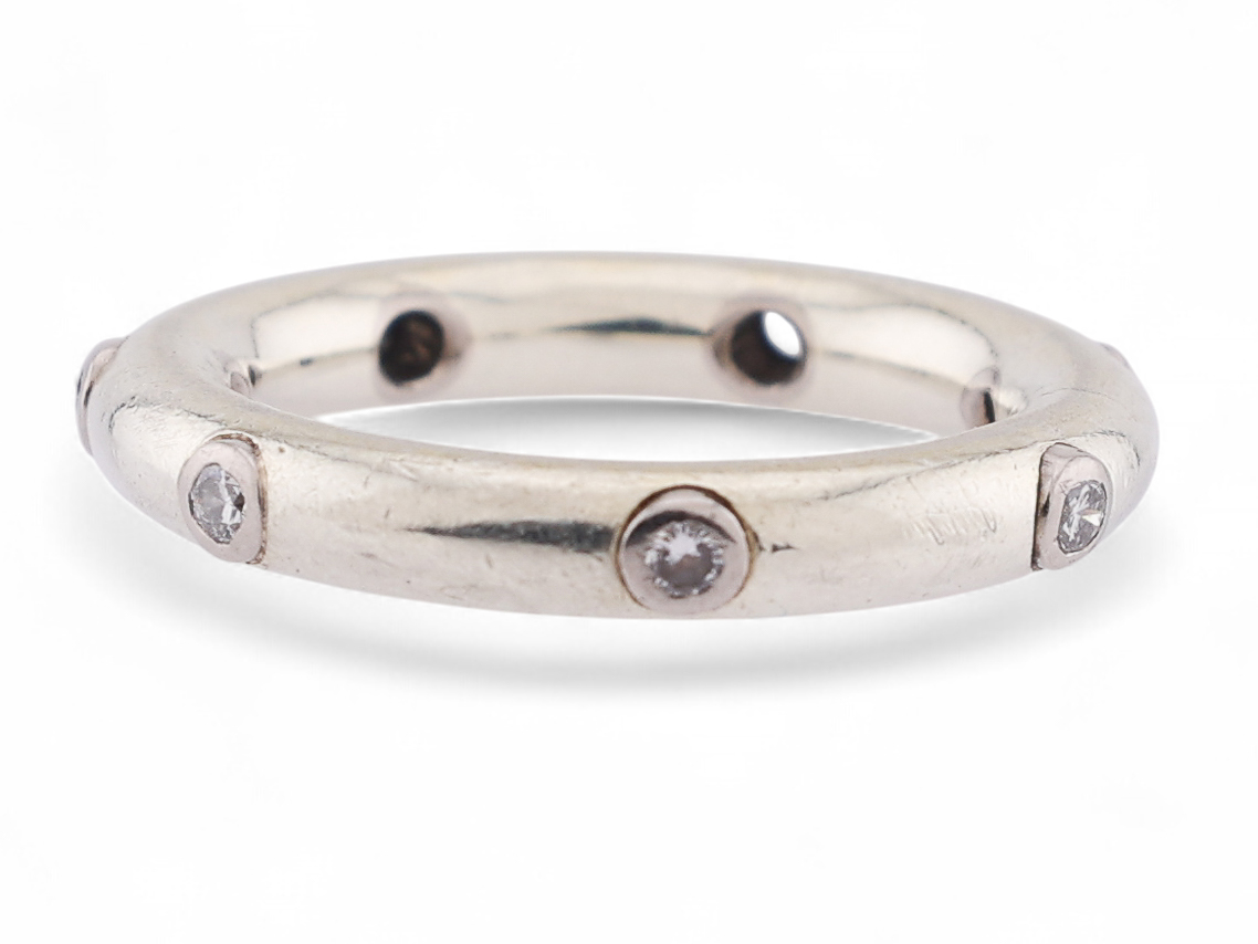 Vintage diamond set eternity band in 9kt white gold. Set around the full circumference with seven spaced round brilliant cut diamonds in circular bezel settings, to a tubular band. Marked 9kt gold.