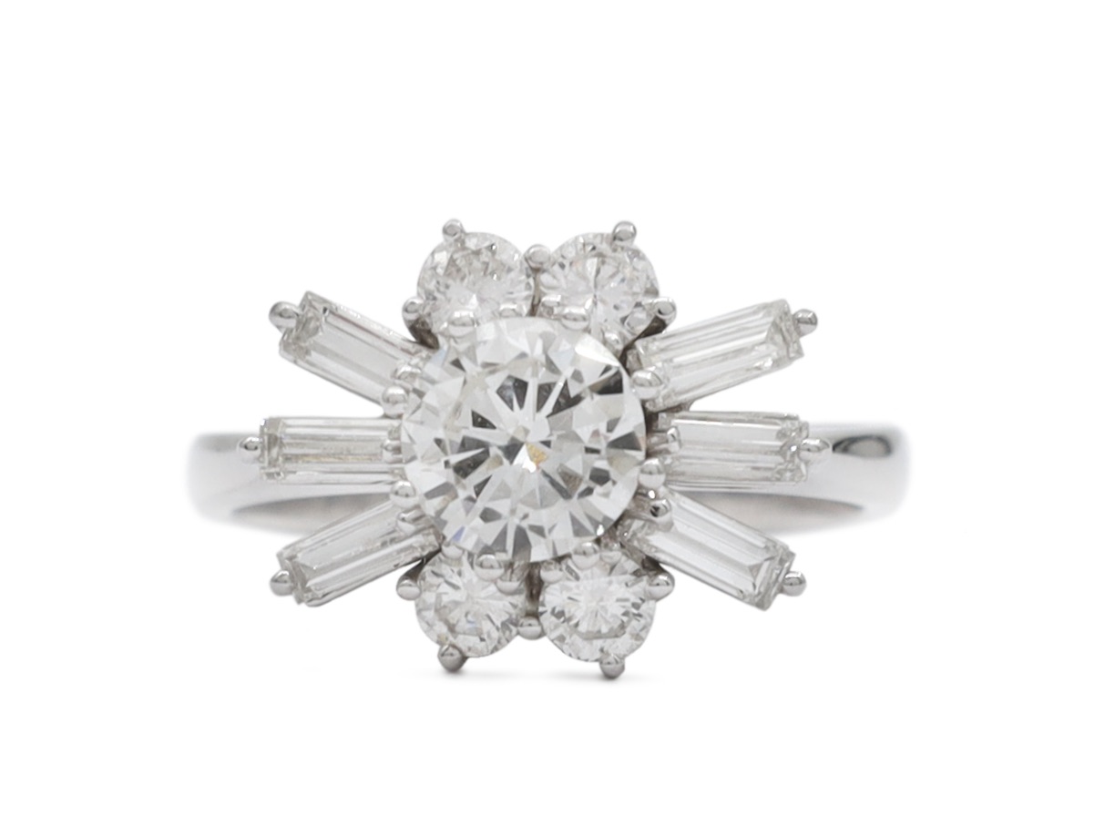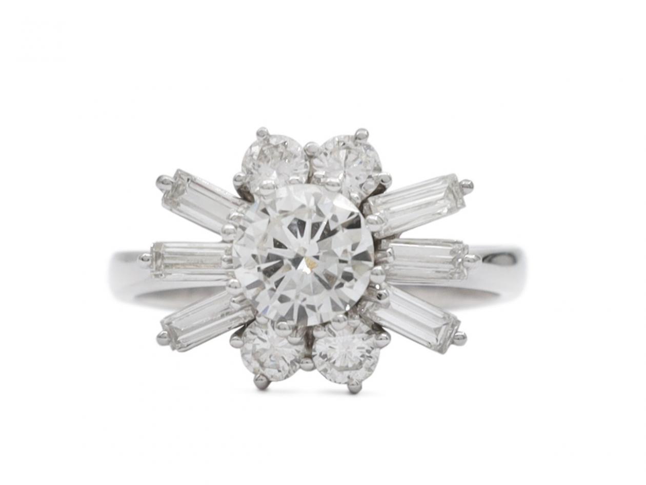Vintage diamond set fancy cluster engagement ring in 18kt white gold. Centred with an estimated 0.66ct round brilliant cut diamond in a raised claw setting, set to top and bottom with four round brilliant cut diamonds in claw settings, flanked to either side with six rectangular baguette cut diamonds in claw settings, to a raised fancy cluster design, featuring curving claws, openwork structured gallery and met to either side with raised inwardly tapering shoulders which broaden to a solid shank. Estimated total diamond weight 1.70cts. Marked 18kt gold.
