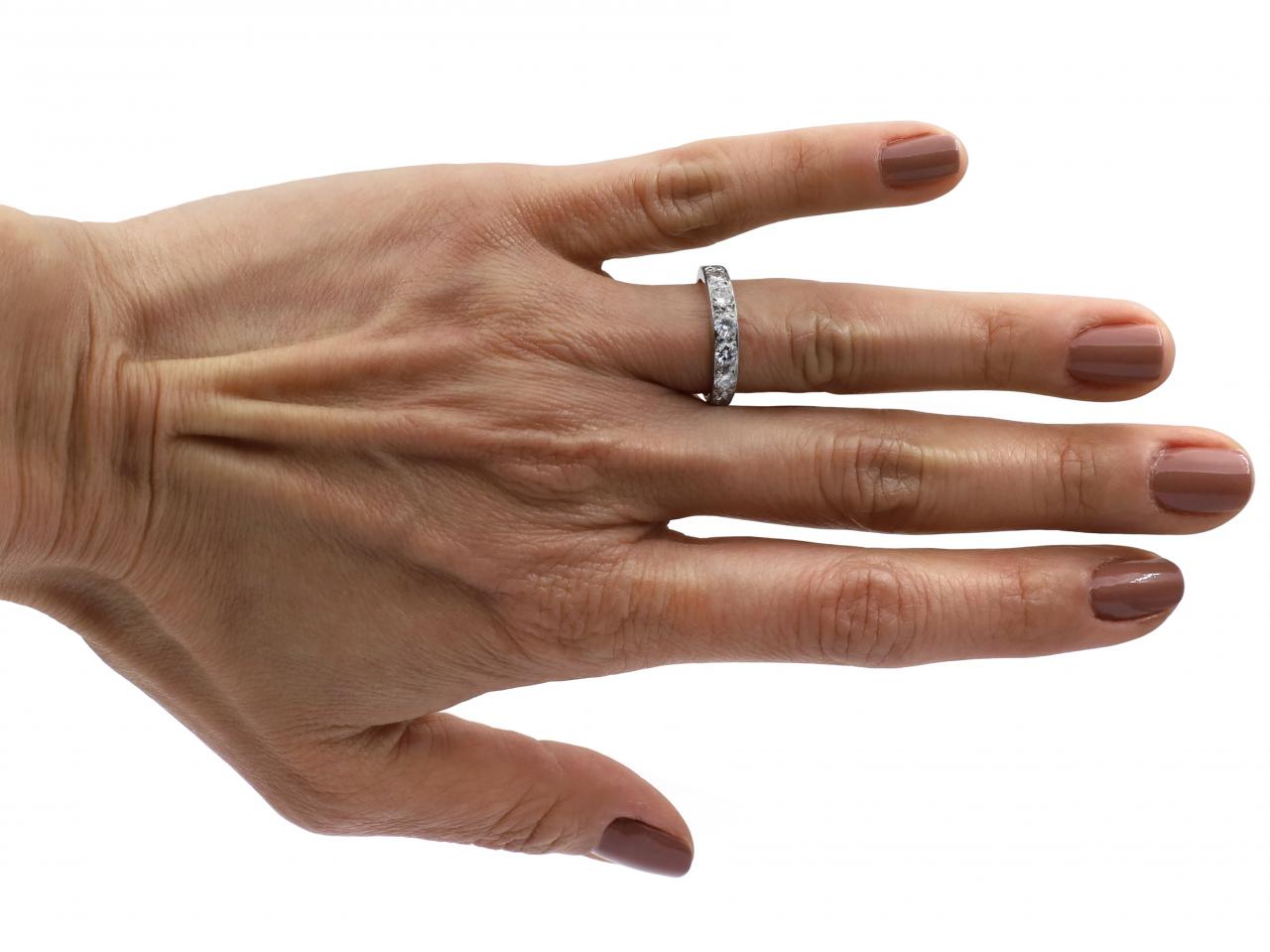 Vintage diamond set half eternity ring in 18kt white gold. Set across the finger with seven round brilliant cut diamonds in grain settings, to a half eternity with subtly raised borders which terminate to a polished gallery and met to either side with integrated shoulders which curve to a solid shank. Estimated total diamond weight 1.00cts.
