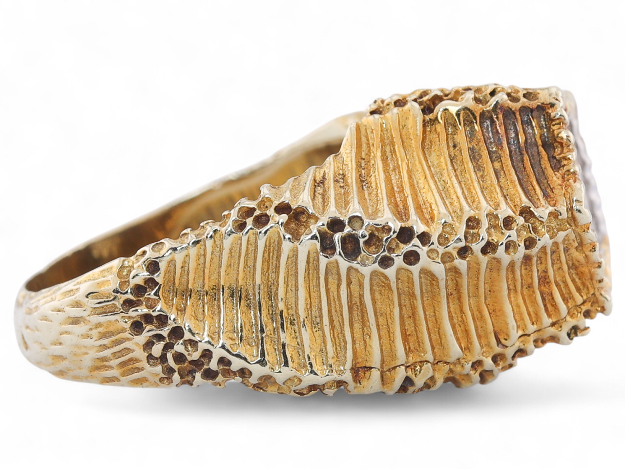 A 1970s dress ring with a textured stepped mount, pavé set with round brilliant cut diamonds estimated at 0.20cts, graded F–G colour, SI clarity. Mounted in 14kt yellow gold.
