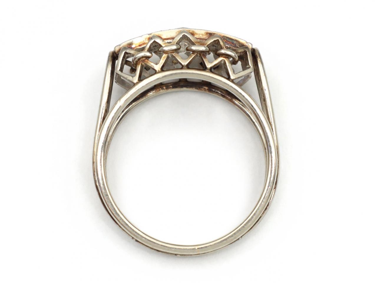 Vintage diamond set wirework ring in 18kt white gold. Centrally set with a round Old cut diamond in a grain setting, further decorated with six old cut diamonds in grain settings, to a truncated marquise plaque with a millegrain border, raised above an intricate cross hatching gallery and met to either side with trumpeting open wirework shoulders which join to a ribbed shank. Estimated total diamond weight 0.60cts. Hallmarked 18kt gold.