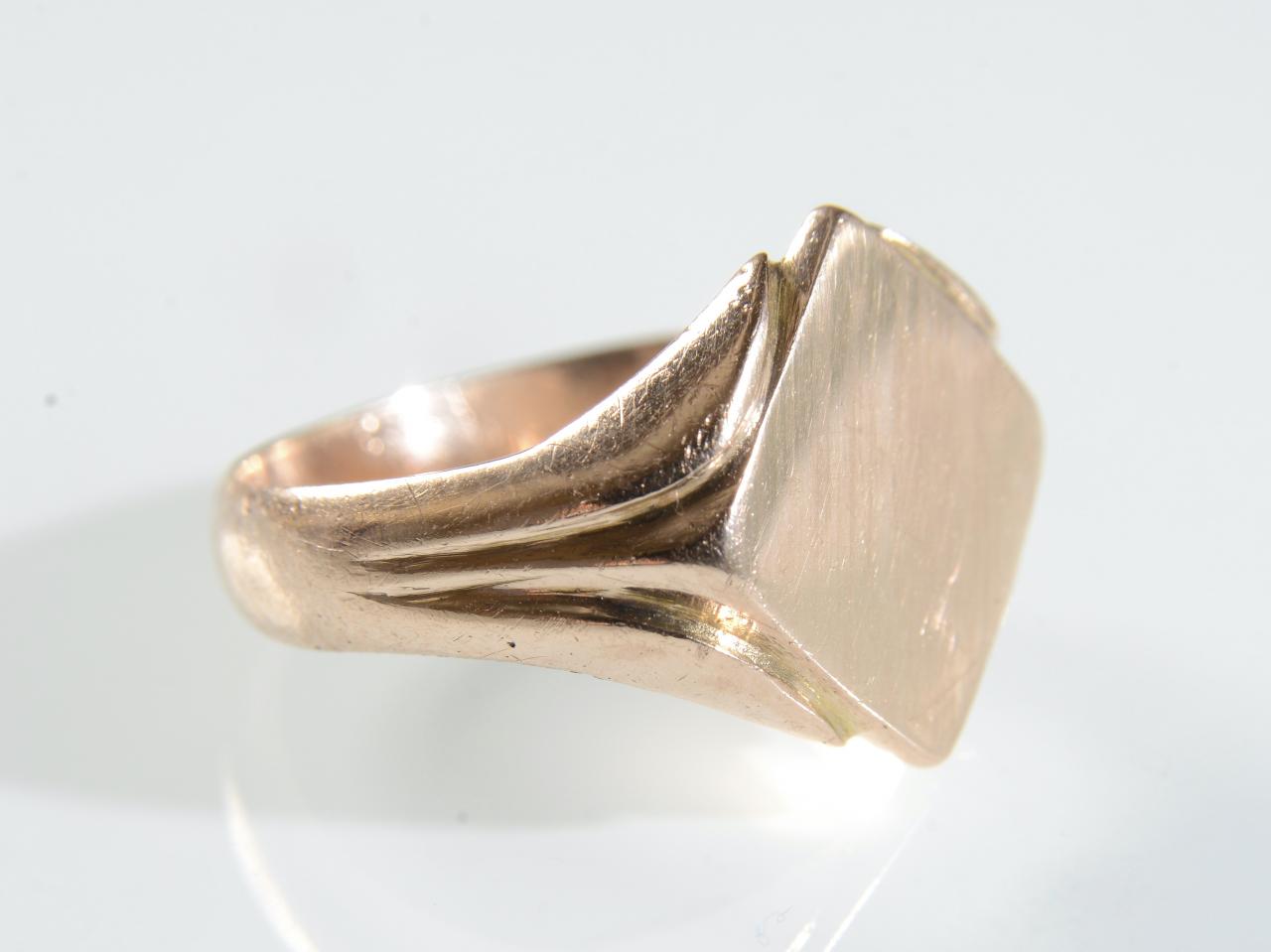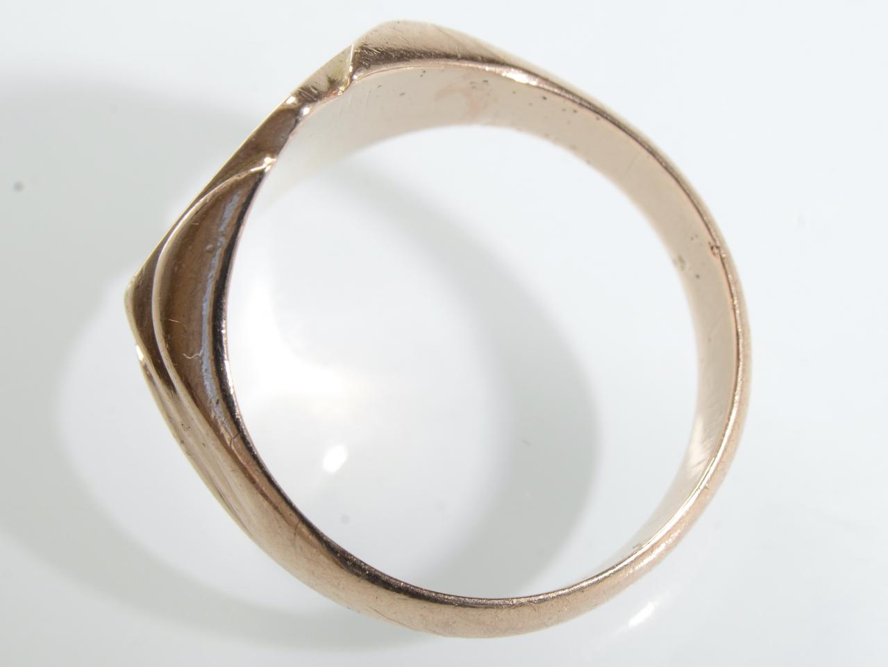 Vintage diamond shape signet ring in 9kt rose gold, centred with a polished diamond shape plaque, flanked to either side with trumpeting flared shoulders with ridged engraving which terminates to a solid shank.