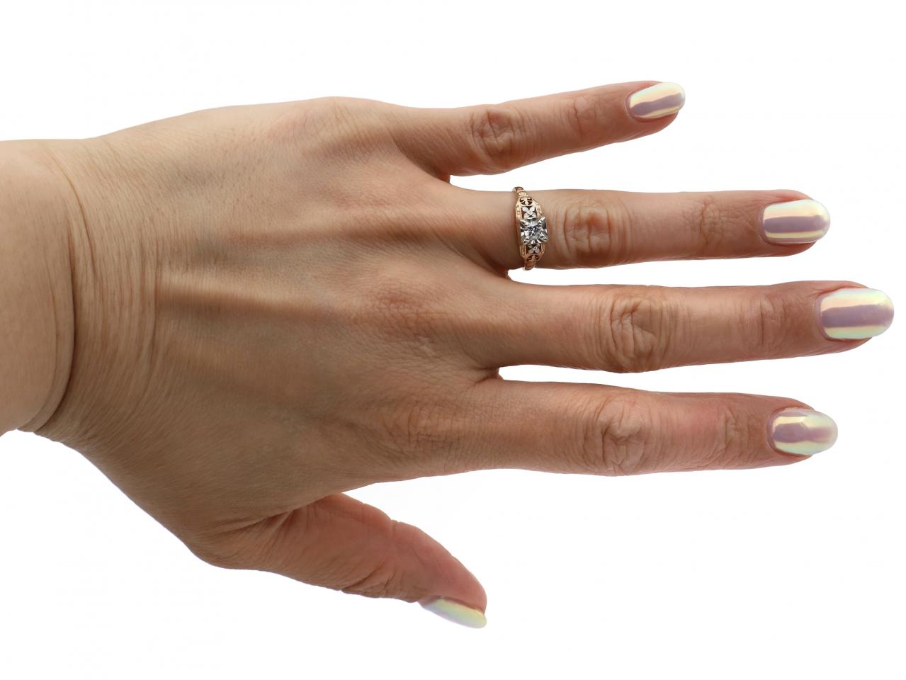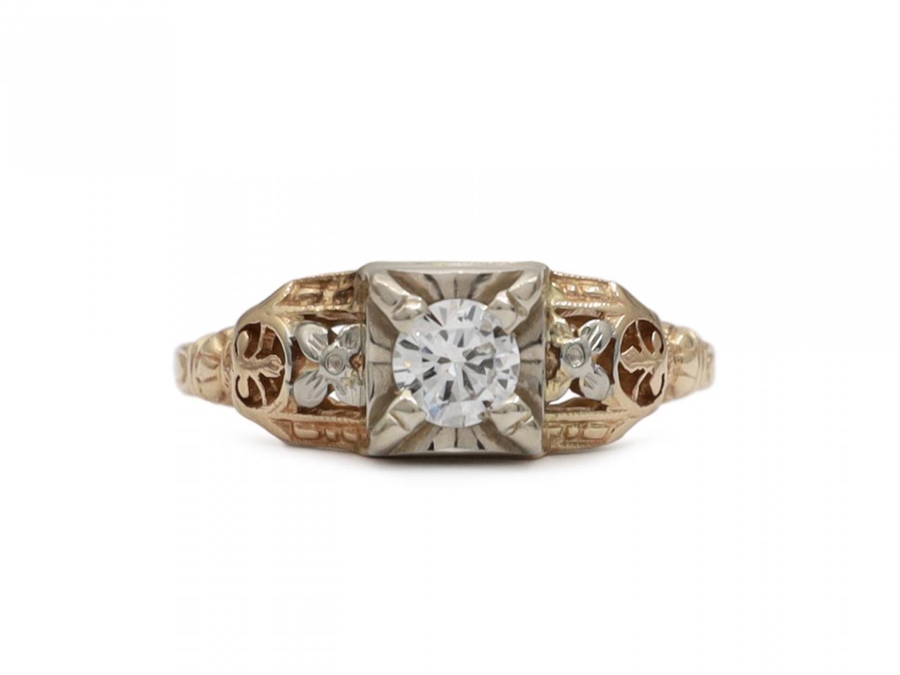 Vintage diamond solitaire engagement ring with floral motifs in 14kt yellow gold. Set with a 0.20ct round brilliant cut diamond in a square collet setting, to an elegant solitaire design with raised structured collet with curving claws, flanked by openwork decorative shoulders featuring intricate floating floral motifs, granulated borders and millegrain edges, terminating to ribbed cuffs before tapering to a slim incised shank. Marked 14kt gold.