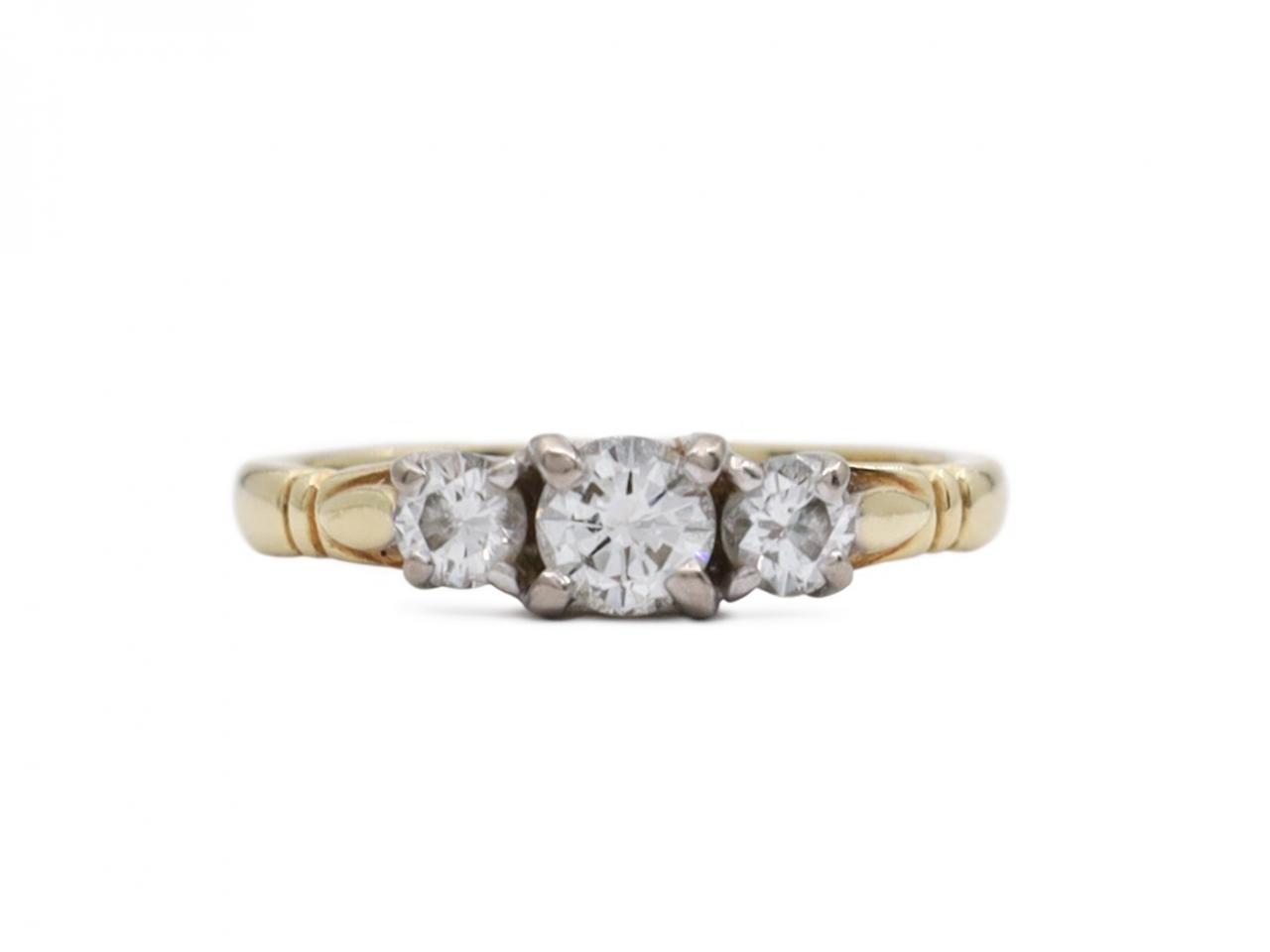 Vintage diamond three stone engagement ring in 18kt yellow gold. Set with three round brilliant cut diamonds in raised four claw settings, to a graduating three stone design with curving claws, structured gallery and met to either side with tri-split shoulders which terminate to double ribbed details beforing continuing to a solid shank. Estimated total diamond weight 0.40cts. Hallmarked 18kt gold, London, 1990.