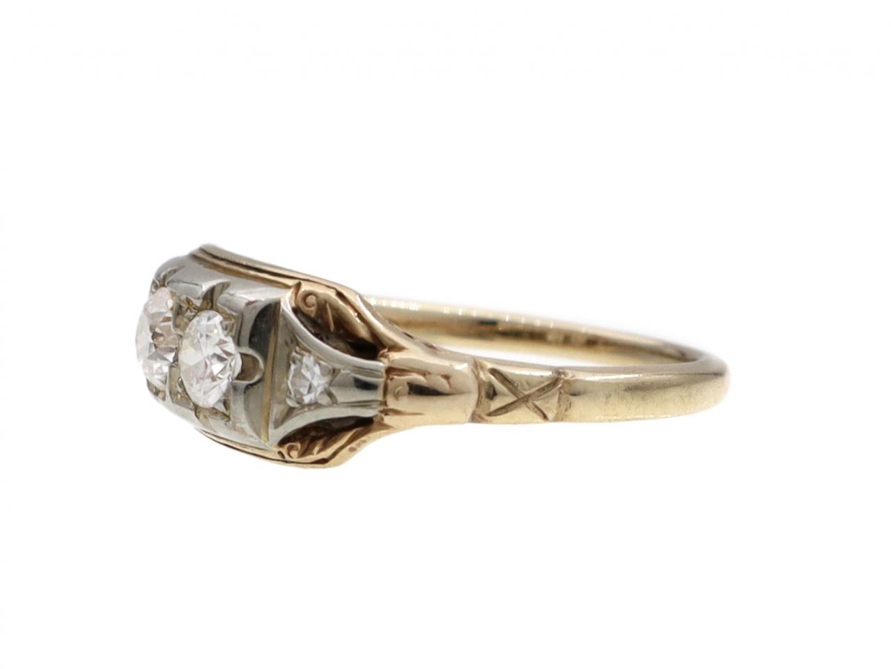 Vintage diamond two stone plaque ring in 14kt white and yellow gold. Set with two round old cut diamonds in square collet settings, to a two stone design featuring a two tone effect, pierced open gallery, integrated trumpeting diamond set shoulders which taper to a solid shank. Estimated total diamond weight 0.50cts.