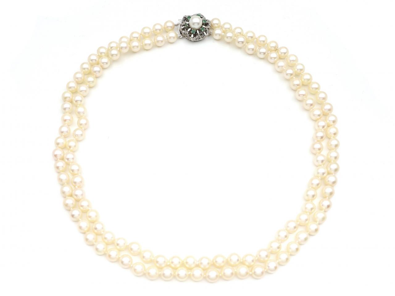 Vintage double strand cultured pearl necklace with 14kt white gold clasp set with emeralds. A pearl necklace consisting of two knotted strands of cultured pearls fitted to the reverse with an openwork textured 14kt white gold push clasp centred with a cultured pearl and surrouned by round mixed cut emeralds in claw settings. Hallmarked 14kt gold.